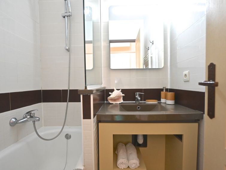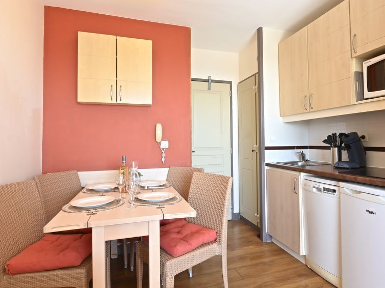 "Le Village (C4228)", 2-room apartment 28 m2 on 1st floor, south facing position. Beautiful furnishings: living room with 2 sofabeds (80 cm, length 190 cm), TV (flat screen). Exit to the terrace. 1 room with 1 french bed (140 cm, length 190 cm). Kitchenette (dishwasher, 4 ceramic glass hob hotplates, toaster, kettle, microwave, electric coffee machine, Capsules for coffee machine (Senseo) extra).