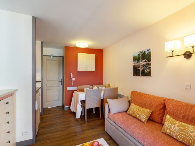 "Le Village (C0 266)", 2-room apartment 28 m2 on 1st floor. Living room with 1 pull-out bed (2 x 80 cm, length 190 cm), TV (flat screen). Exit to the terrace. 1 room with 1 french bed (140 cm, length 190 cm). Kitchenette (4 hot plates, dishwasher, toaster, kettle, microwave, electric coffee machine) with fan.