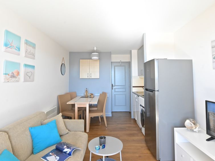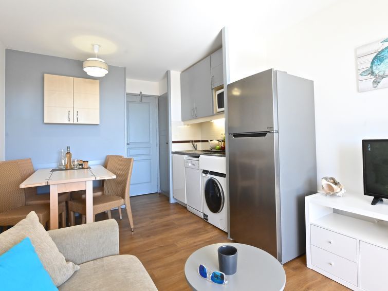 "L'Esquinade (G2 115)", 1-room studio 23 m2 on 1st floor. Object suitable for 2 adults + 2 children. Bright, fully renovated in 2025, comfortable furnishings: living room with 1 double sofabed (1 x 140 cm, length 190 cm), TV (flat screen), air conditioning. Exit to the terrace. Sleeping alcove with 1 x 2 bunk beds (90 cm, length 190 cm).