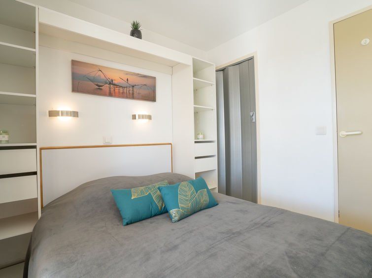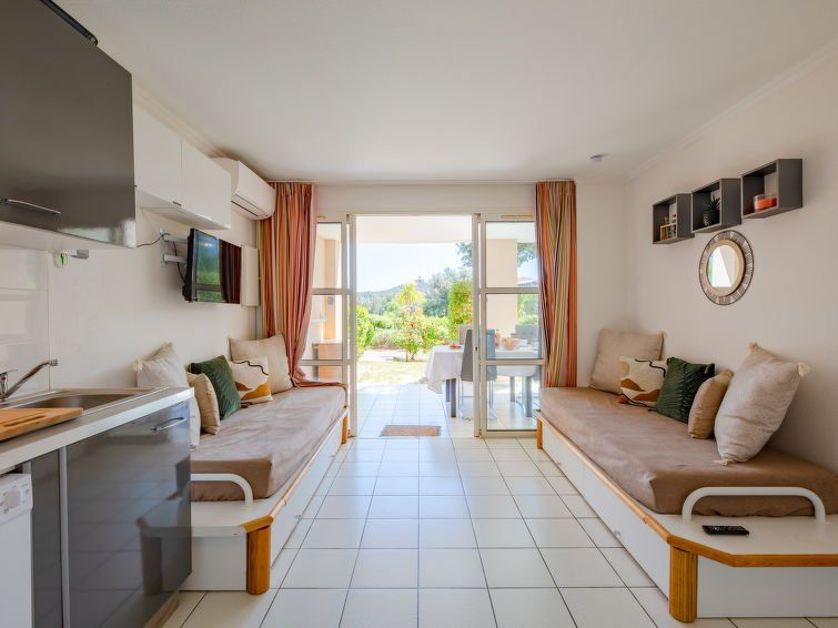 "L'Esquinade (F6 015)", 2-room apartment 30 m2, on the ground floor. Beautiful and cosy furnishings: living room with 2 sofabeds (80 cm, length 190 cm), TV (flat screen). Exit to the terrace. 1 small room with 1 french bed (140 cm, length 190 cm). Exit to the terrace. Kitchenette (4 hot plates, dishwasher, toaster, kettle, microwave, electric coffee machine, Capsules for coffee machine (SENSEO) extra).