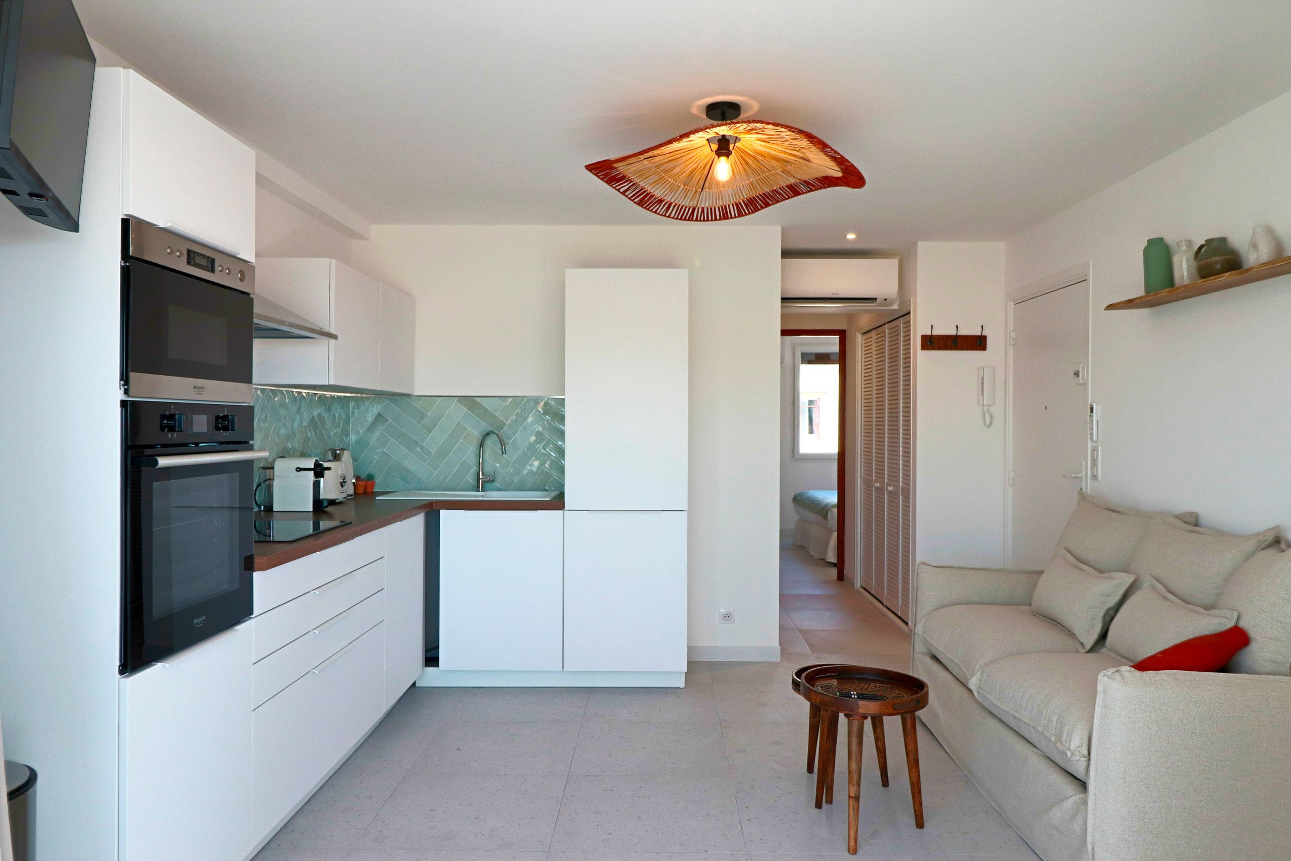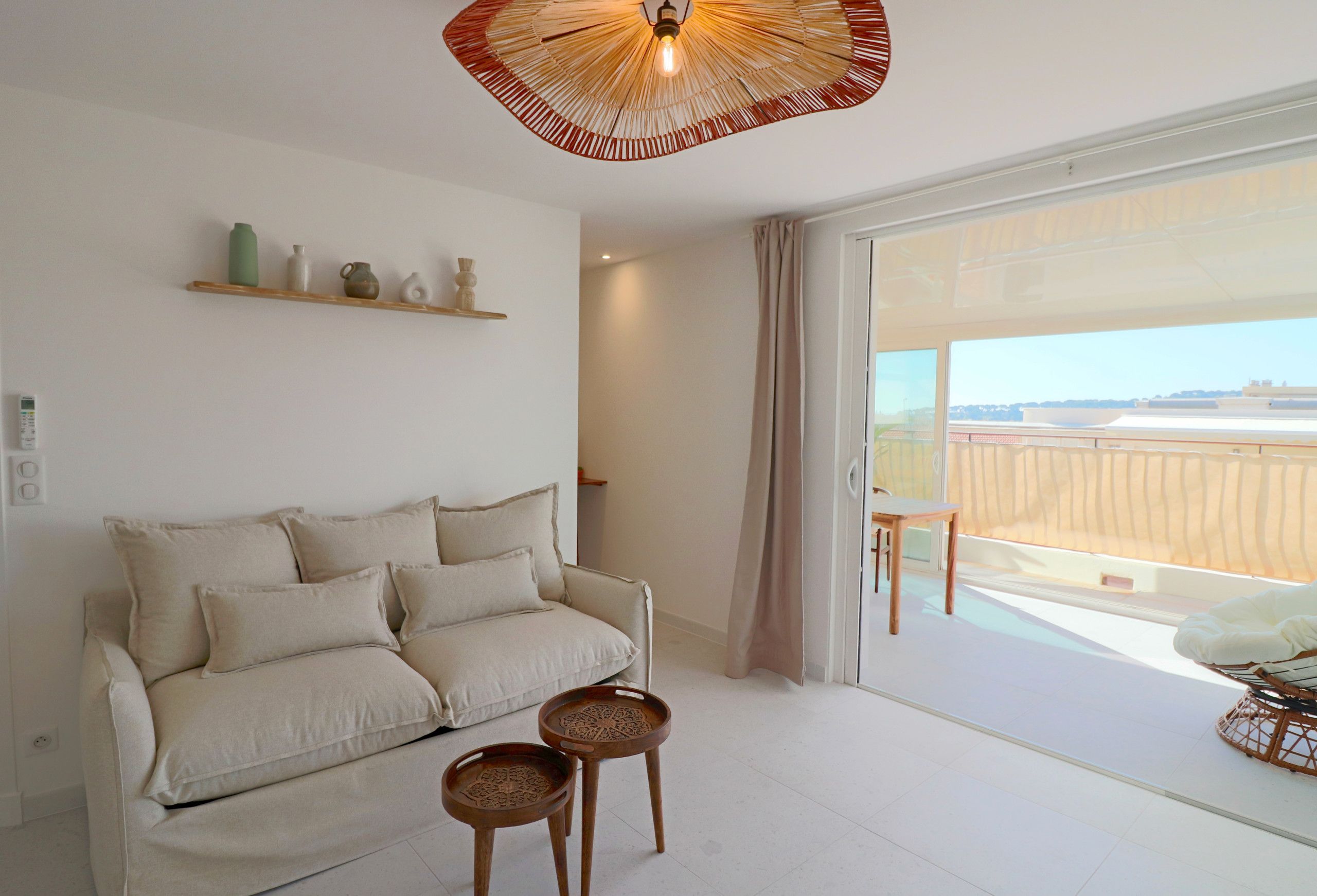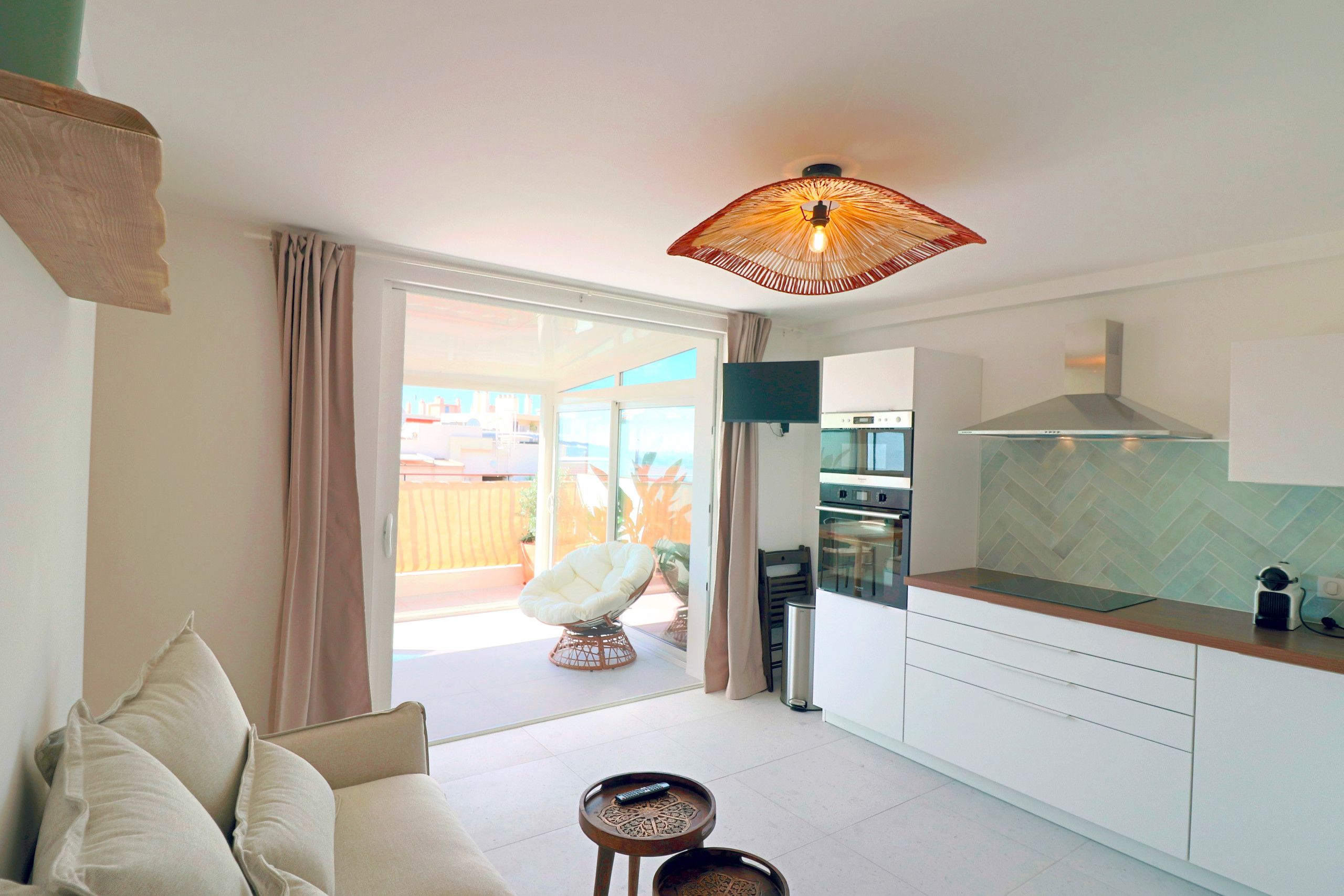 This mini penthouse puts you right in the heart of Antibes – but with no neighbours above or next to you, you'll have some peace amidst the hustle and bustle. The real highlight is the veranda, with its sea glimpses and cosy nook for relaxing or eating alfresco. Inside, the apartment is compact, but it's perfectly functional. At full capacity, one guest will be on the sofa bed, so it might be a bit snug. The location is ideal, though. Ponteil Beach and Juan-Les-Pins are both just a short walk, and the charming streets of Old Antibes are even closer.