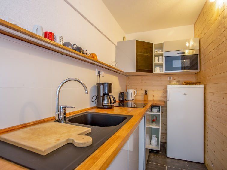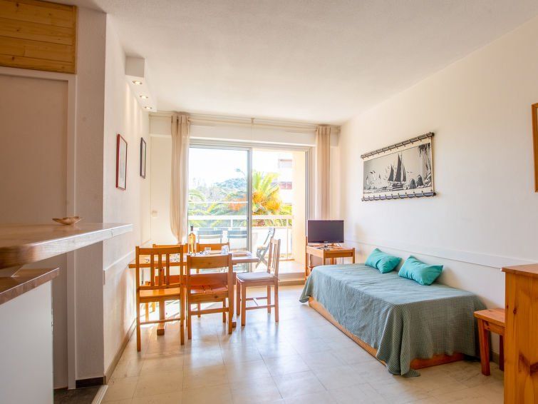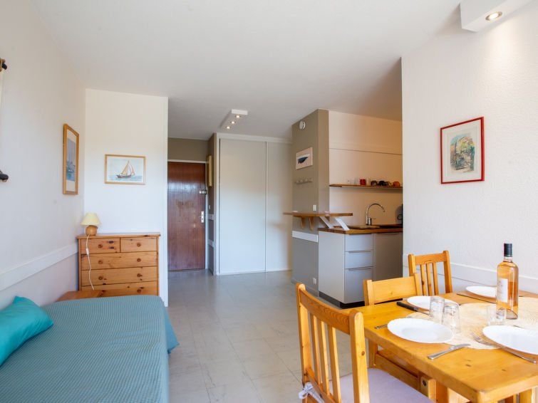 2-room apartment 34 m2 on 1st floor. Living/dining room with dining nook and TV (flat screen). Exit to the balcony. Entrance hall with 1 x 2 bunk beds (80 cm, length 190 cm). 1 room with 1 french bed (140 cm, length 190 cm). Exit to the balcony. Kitchenette (3 hot plates, toaster, kettle, microwave, electric coffee machine).