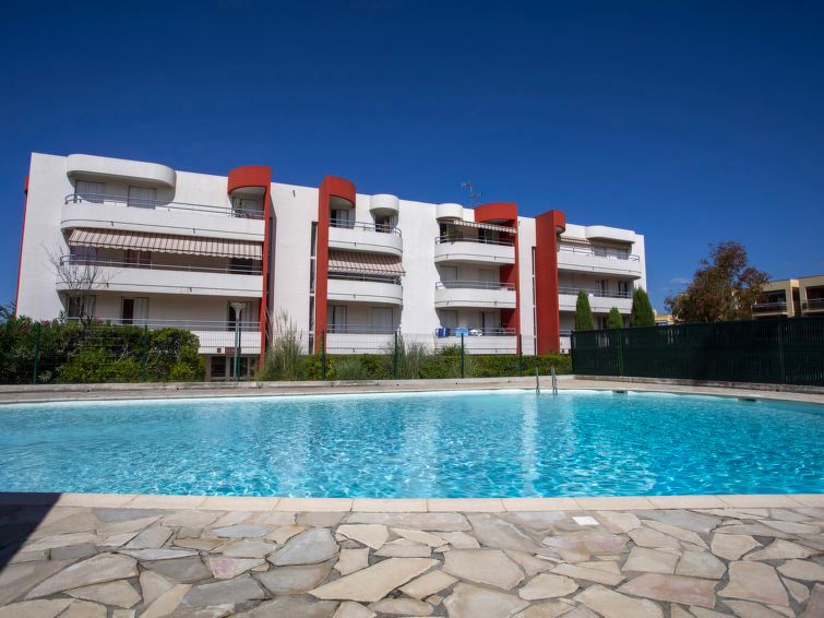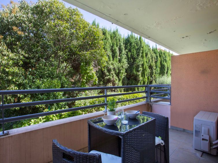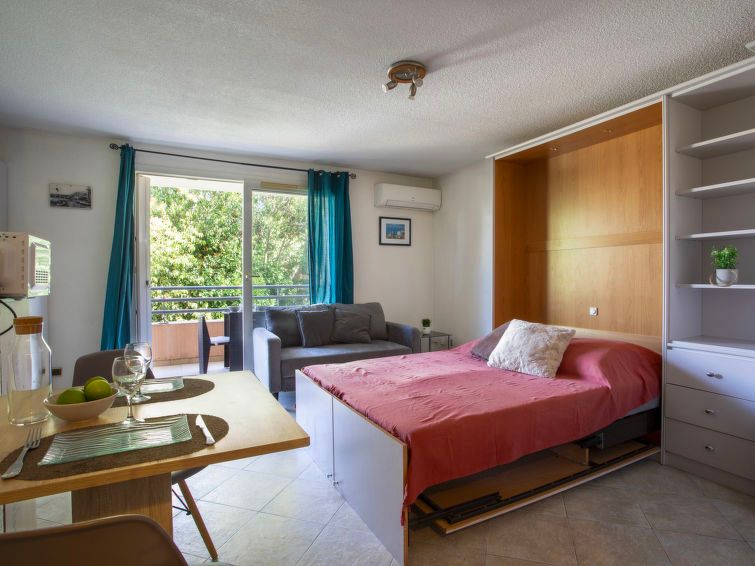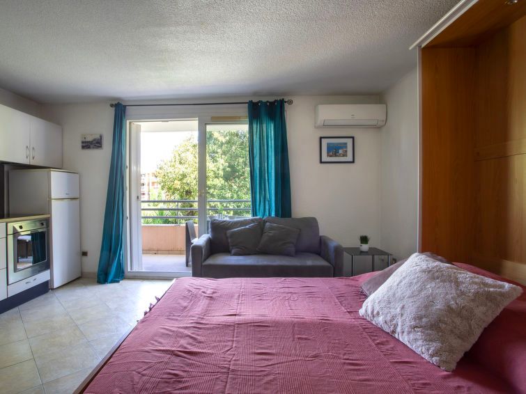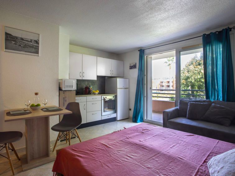 1-room studio 26 m2 on 1st floor. Simple furnishings: living/dining room with 1 double fold-away bed (1 x 140 cm, length 190 cm), TV (flat screen). Exit to the balcony. Kitchenette (oven, 3 induction hot plates, toaster, kettle, microwave, electric coffee machine). Exit to the balcony.