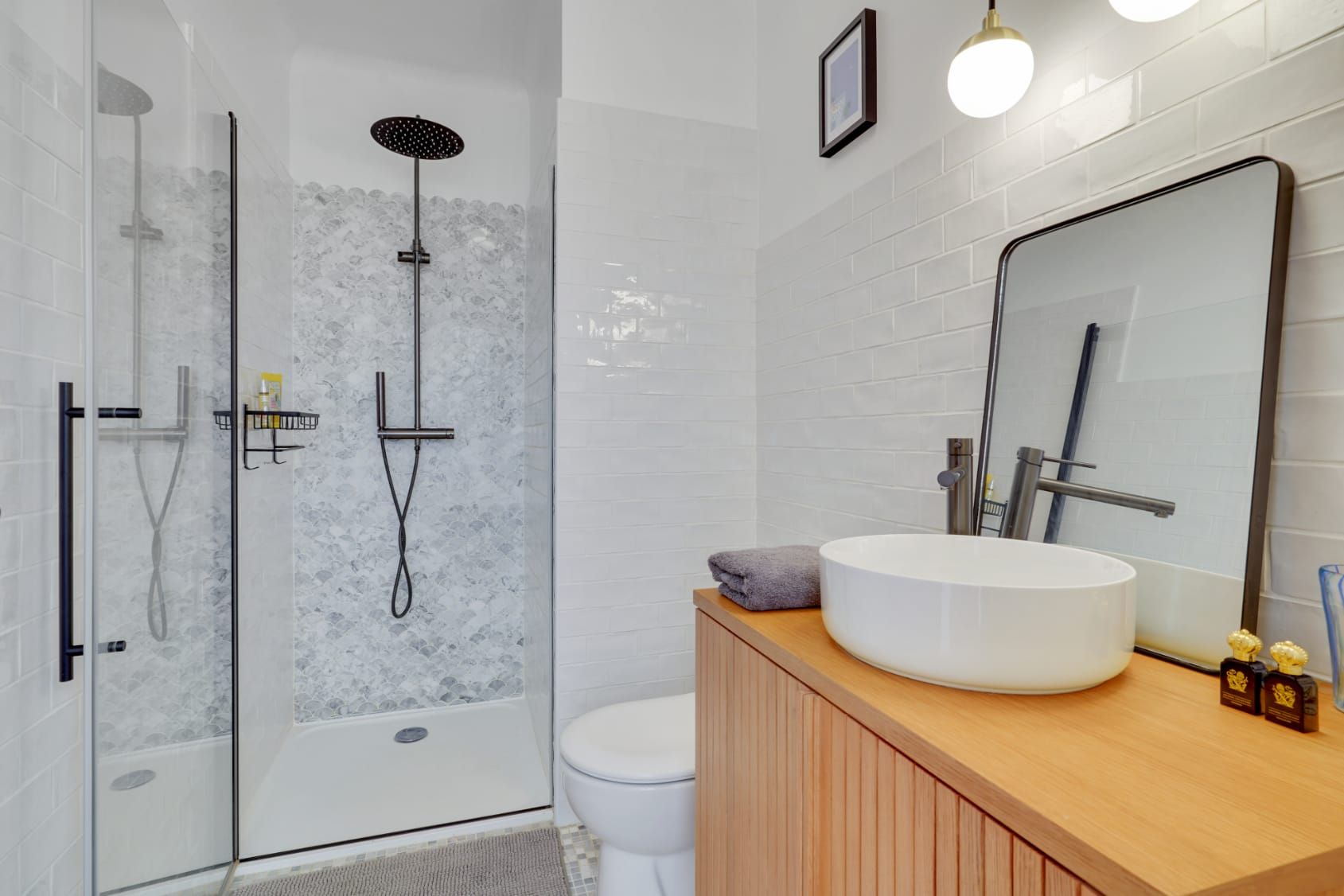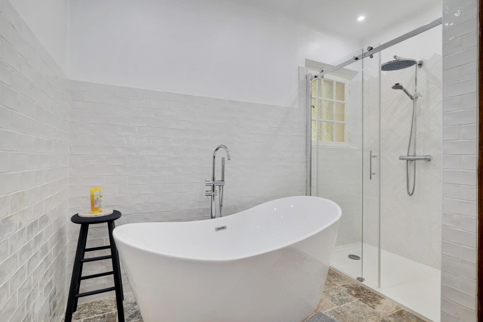 The bedrooms are all overlooking the garden, with doors out to the main terrace, and they're a mix of period features and modern styling. And we're big fans of the bathrooms here – they wouldn't look out of place in a boutique hotel.