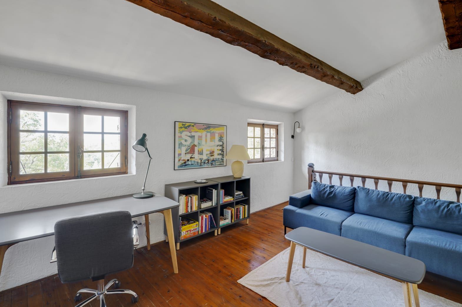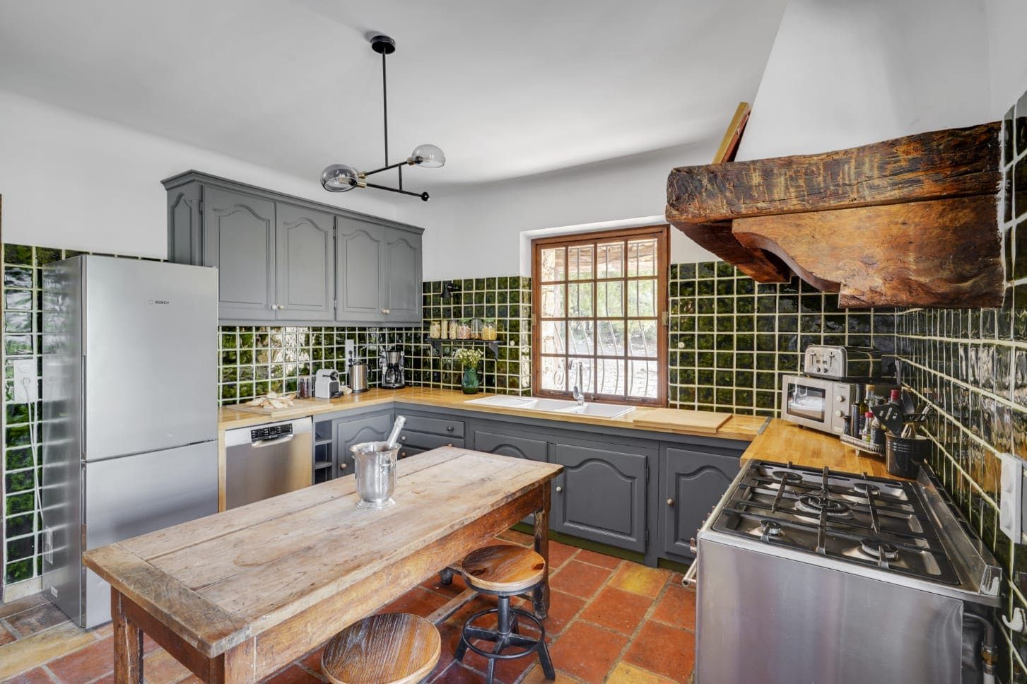 Built from local stone, with ancient timbers and tiled floors, its most striking room has to be the main living room. Here, under the double-height ceiling, you'll find a grand fireplace, comfy modern sofas, and a large dining table – with doors out to a covered dining terrace and stairs up to a mezzanine with a desk. There's a practical kitchen with everything you'll need for cooking even the largest meals at home, along with a separate snug room with a squashy corner sofa.