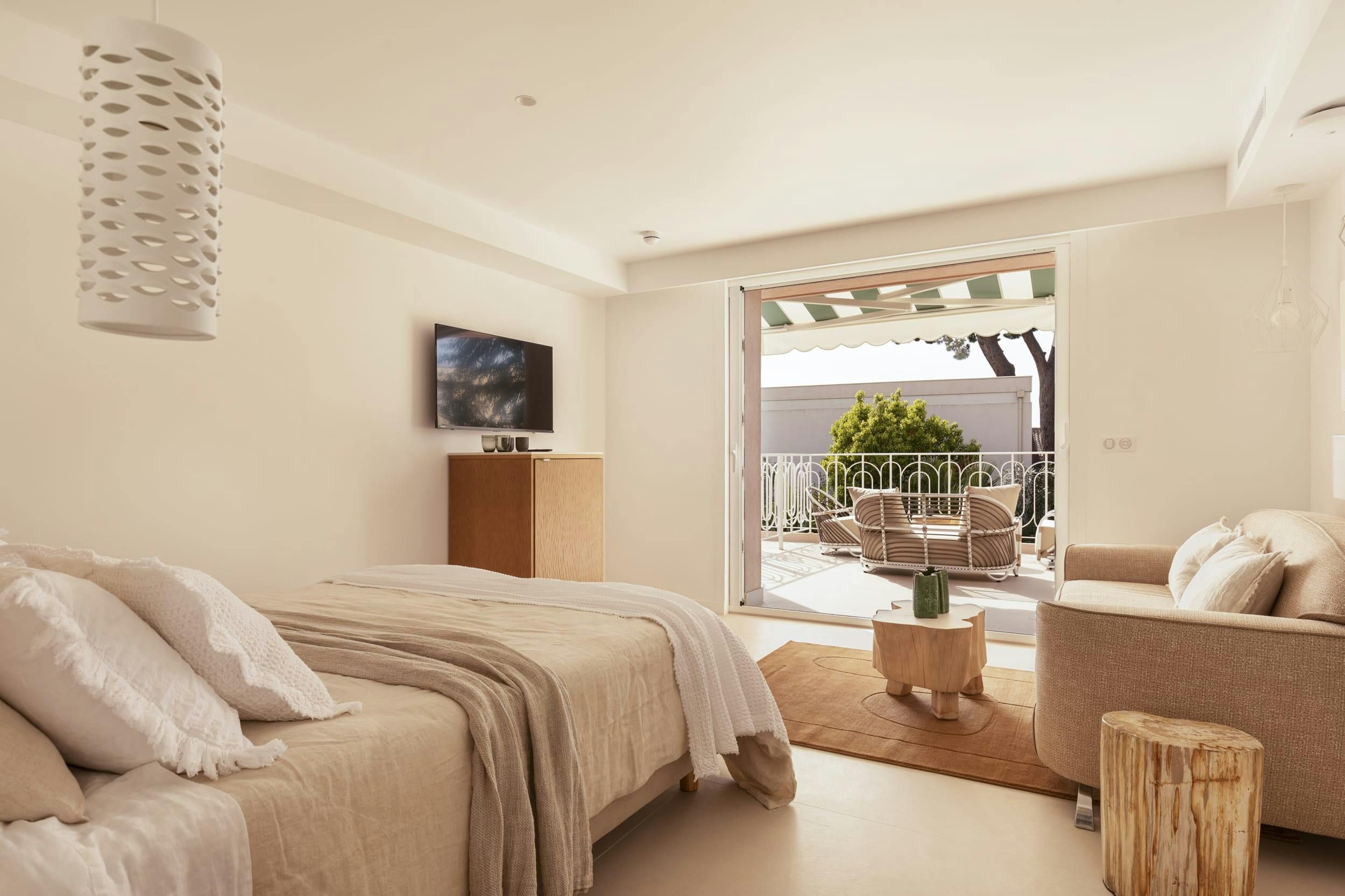 Located in a Californian-style residence, this comfortable room welcomes a solo traveller or couple. There is no kitchen here, only a small fridge and hot drinks station, so you’ll need to head out at meal times. The terrace is the ideal spot for enjoying a sundowner, and the communal pool is a welcome addition in the summer. The Boulevard de la Croisette is a ten-minute walk away, connecting you to Croisette Beach and the heart of Cannes, where you’ll find eateries, boutiques and bars.