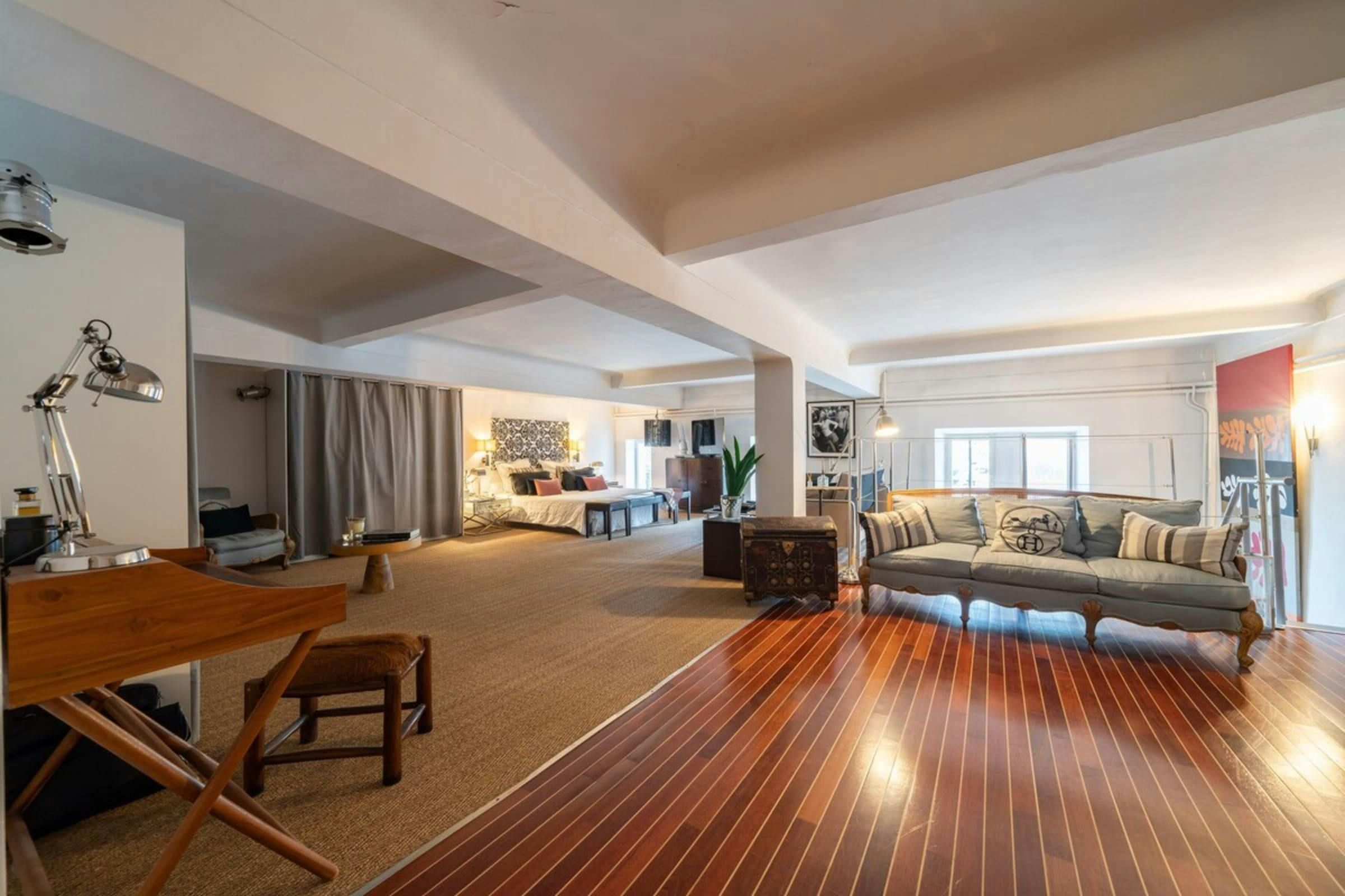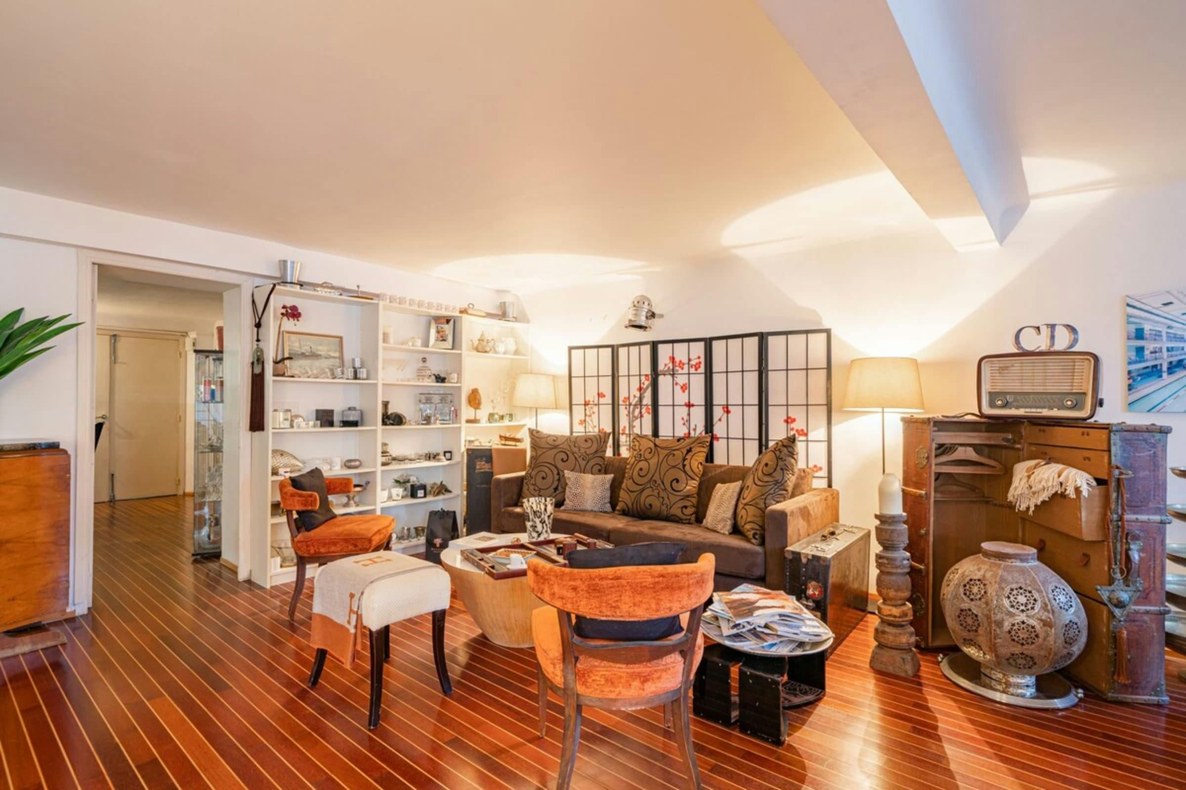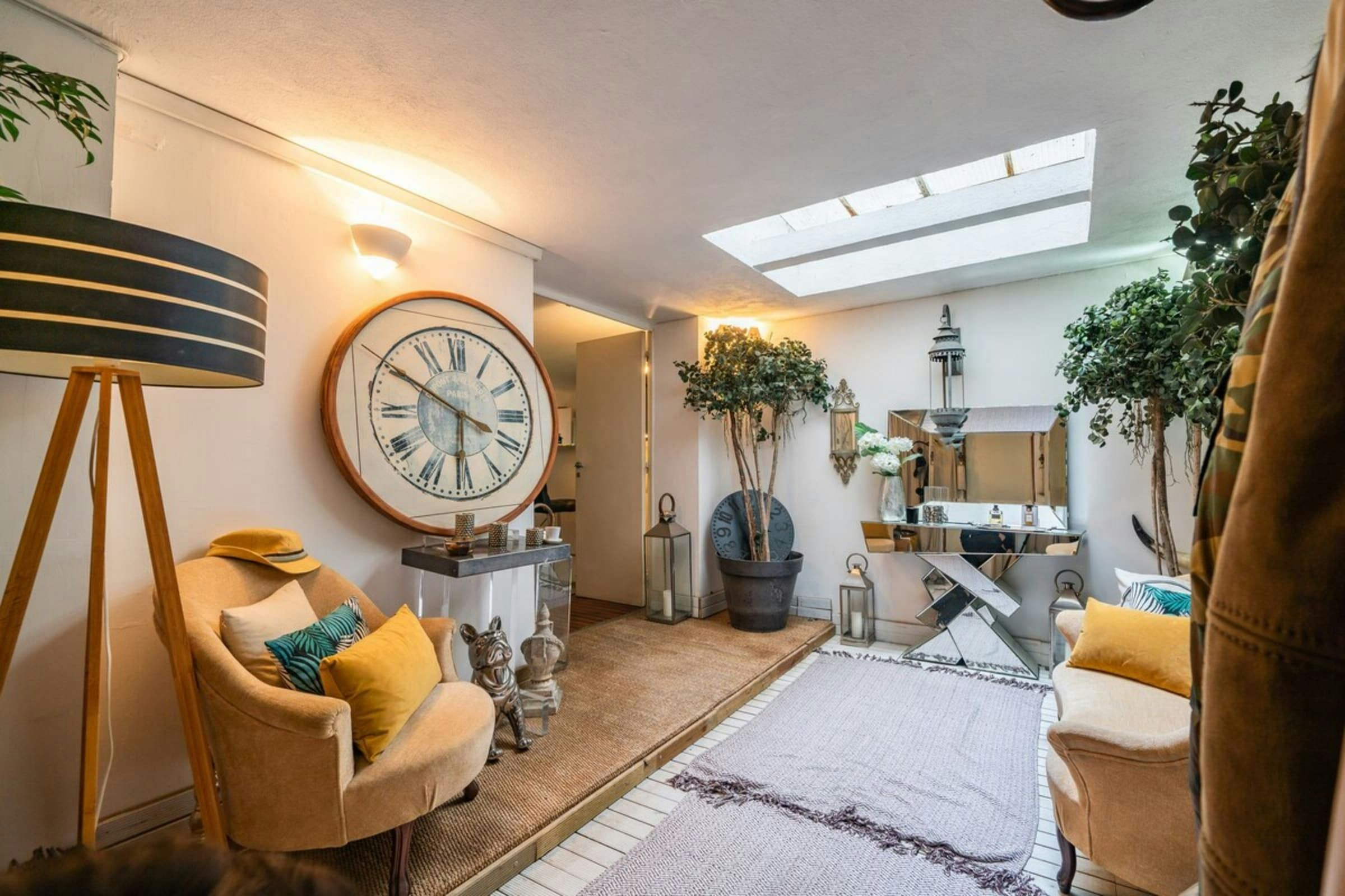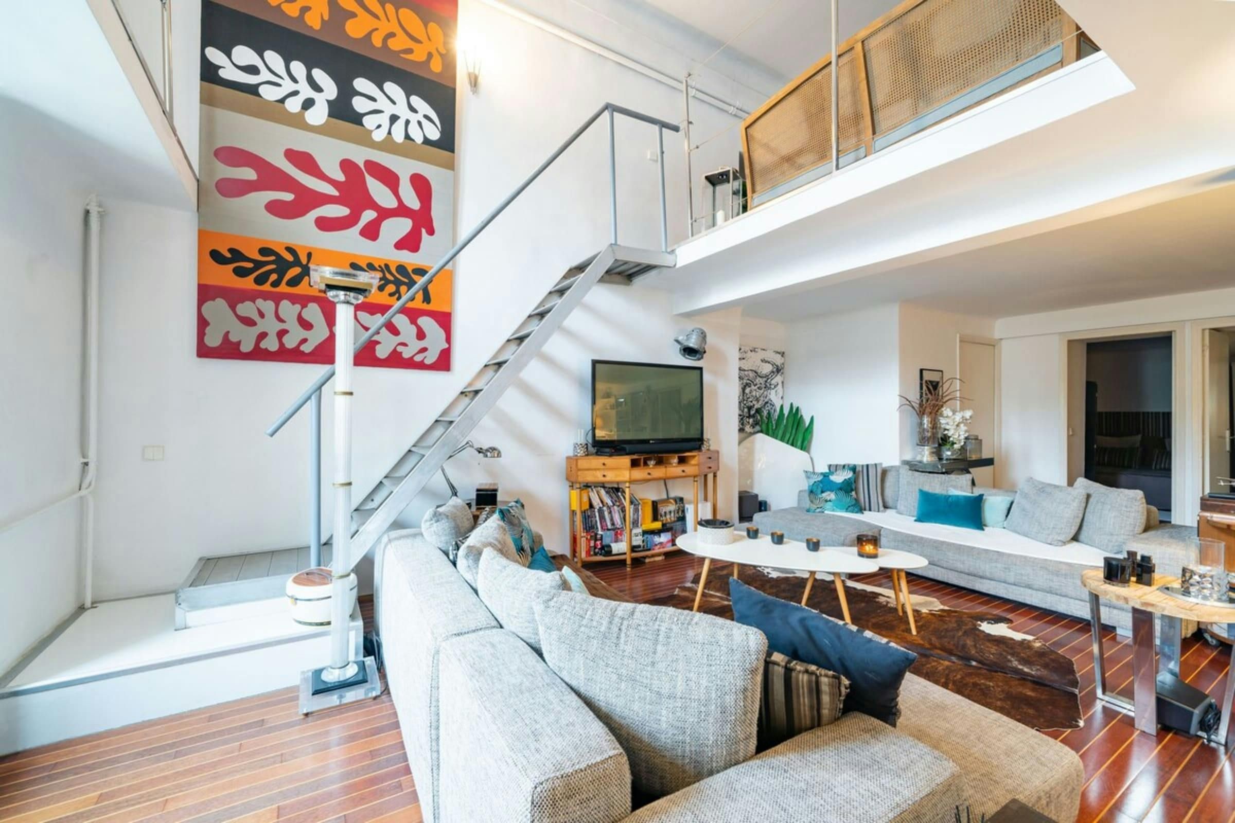 This is a unique home with lots of character. It’s spread over two floors, with one bedroom on a huge mezzanine level with a sitting room – this set-up isn’t entirely private as it’s partially open to the ground floor. There’s plenty of room for you to enjoy your own space, though, with several comfy seating areas and a long dining table perfect for entertaining. You’ll be just a twelve-minute walk from the Croisette and the beaches, and Palais des Festivals is only fifteen minutes away.