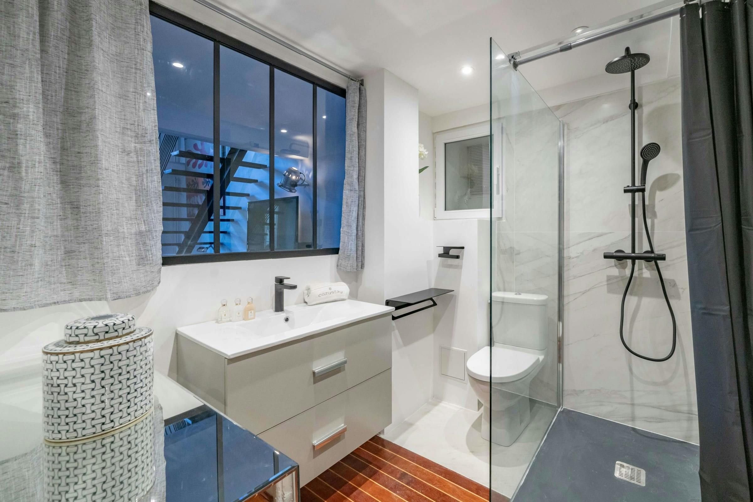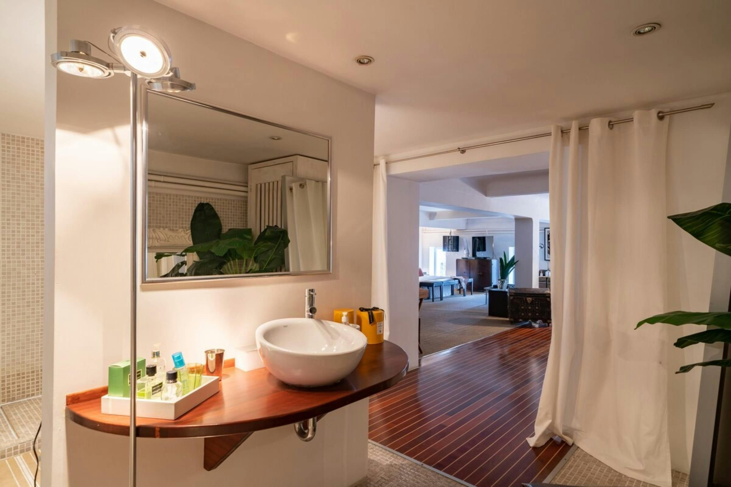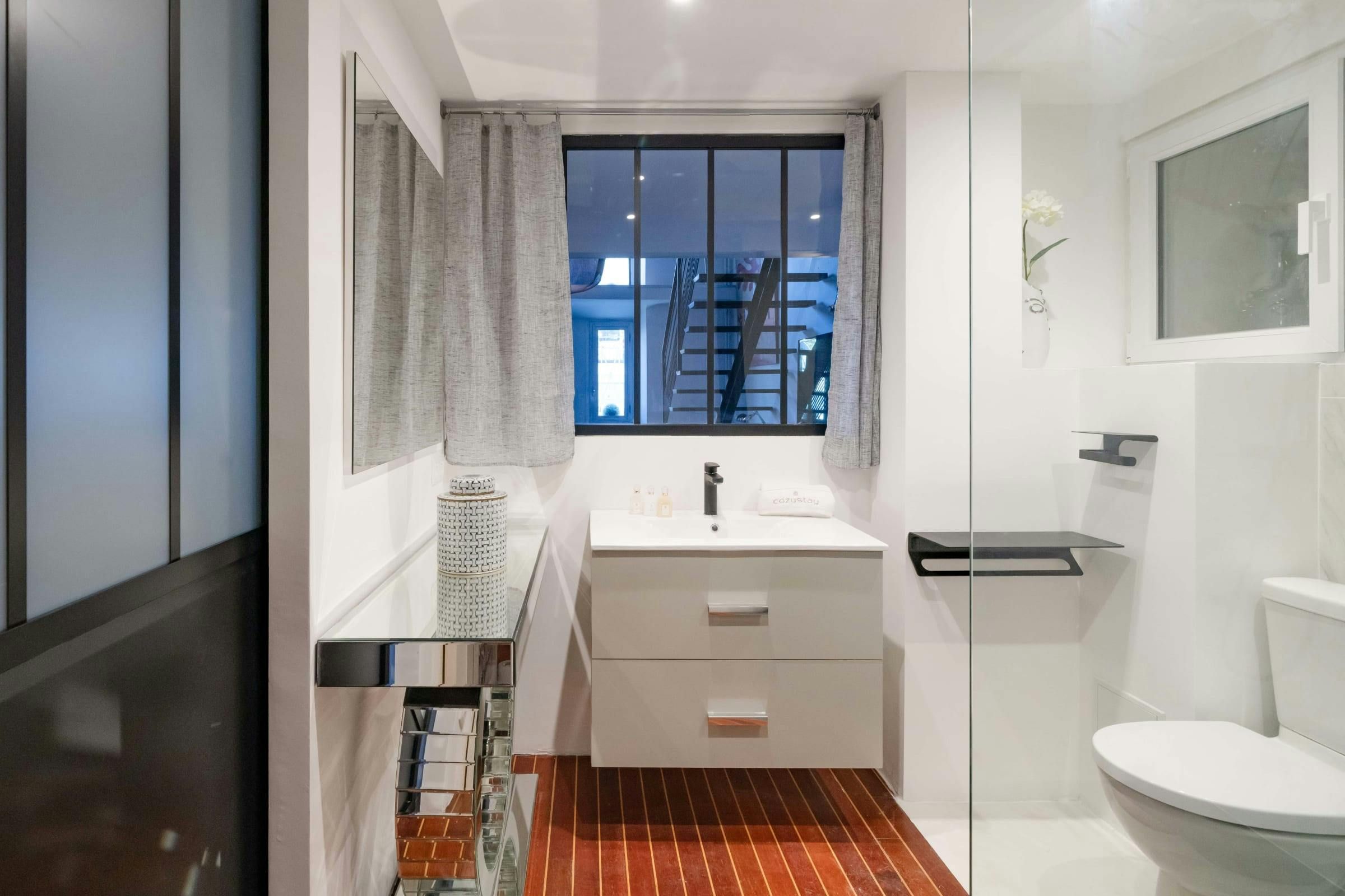 *The bathroom on the mezzanine level is only closed off with a curtain, rather than a door.