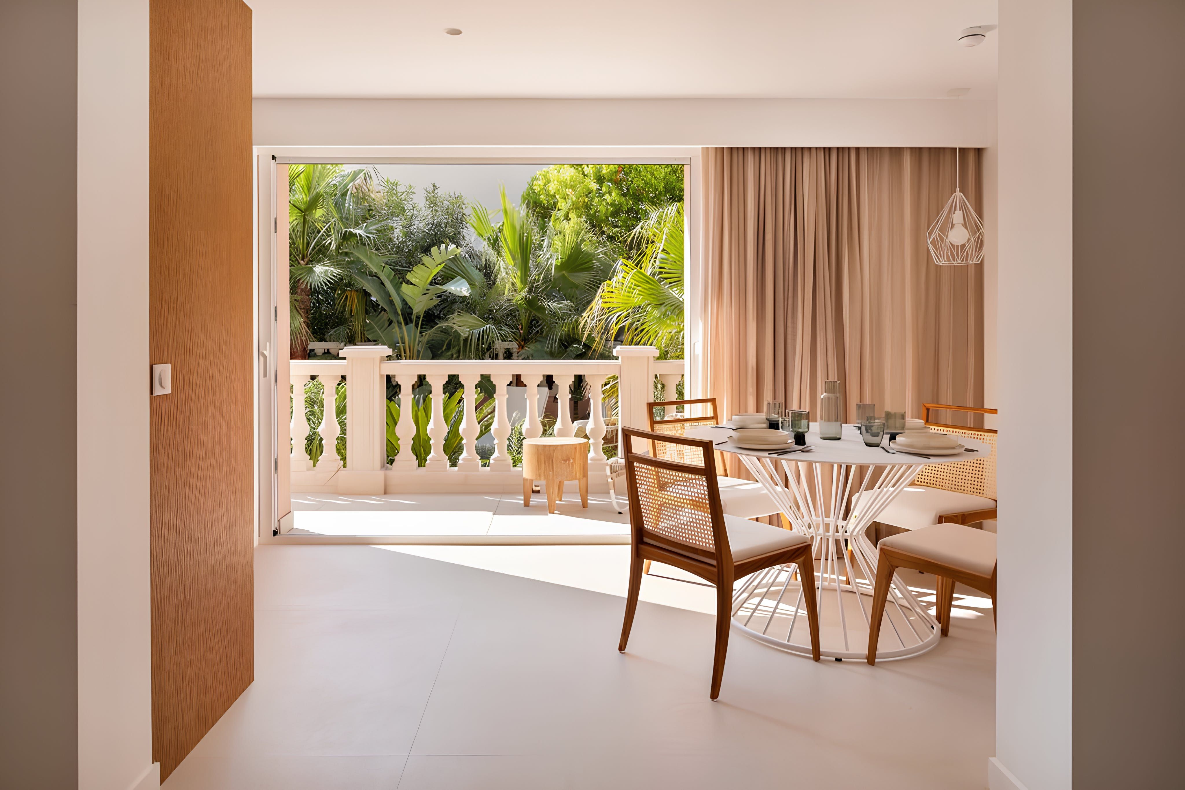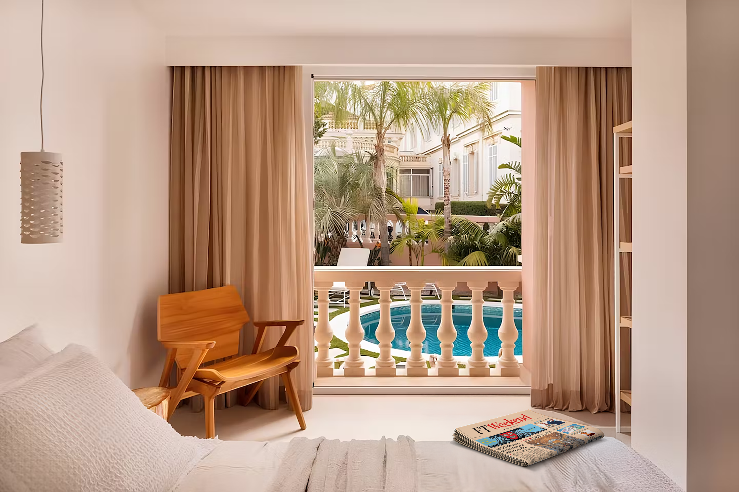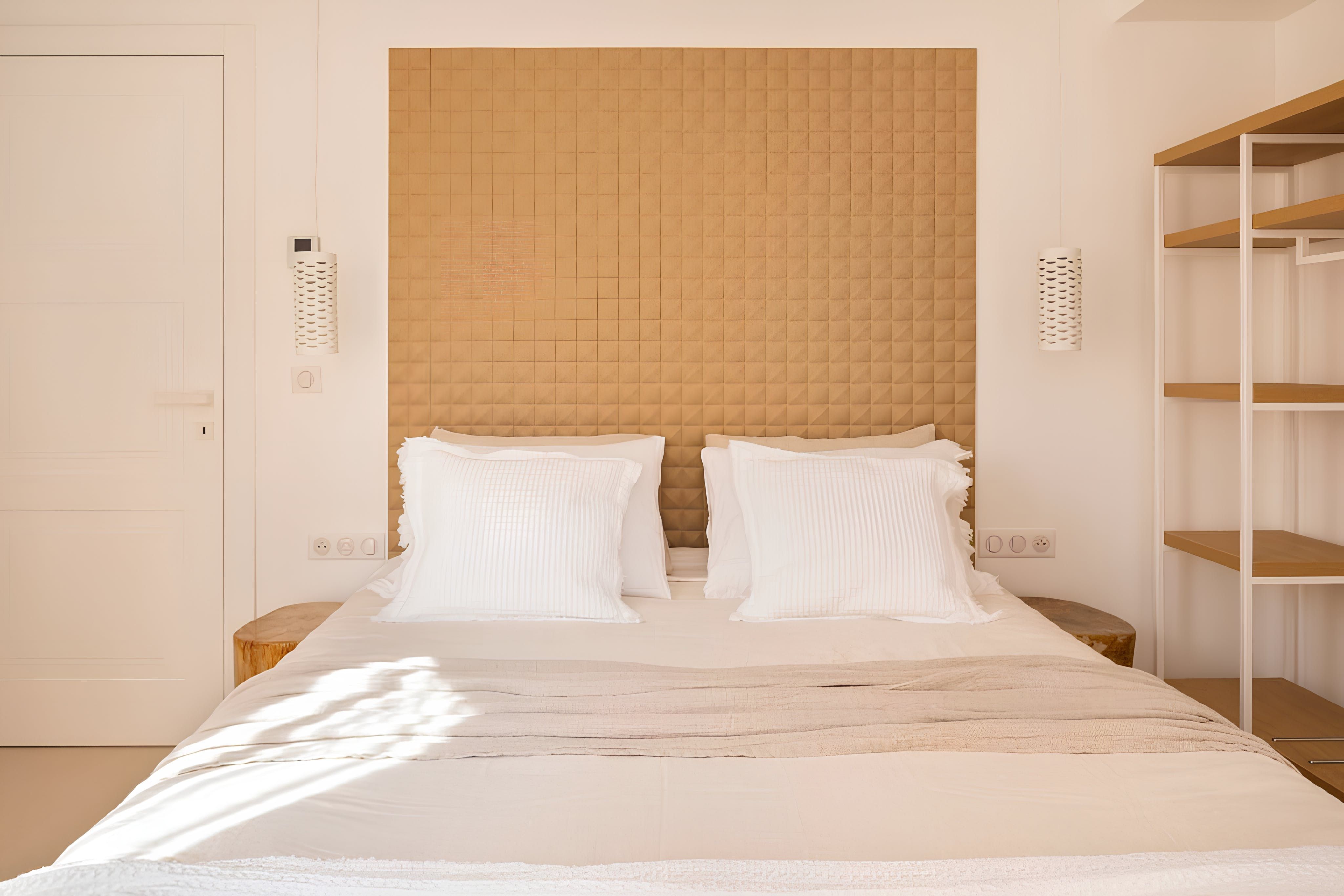 *At full occupancy, one guest will be sleeping on the sofa bed in the living room. It’s worth noting the bedrooms overlook the shared pool so it doesn’t feel completely private.