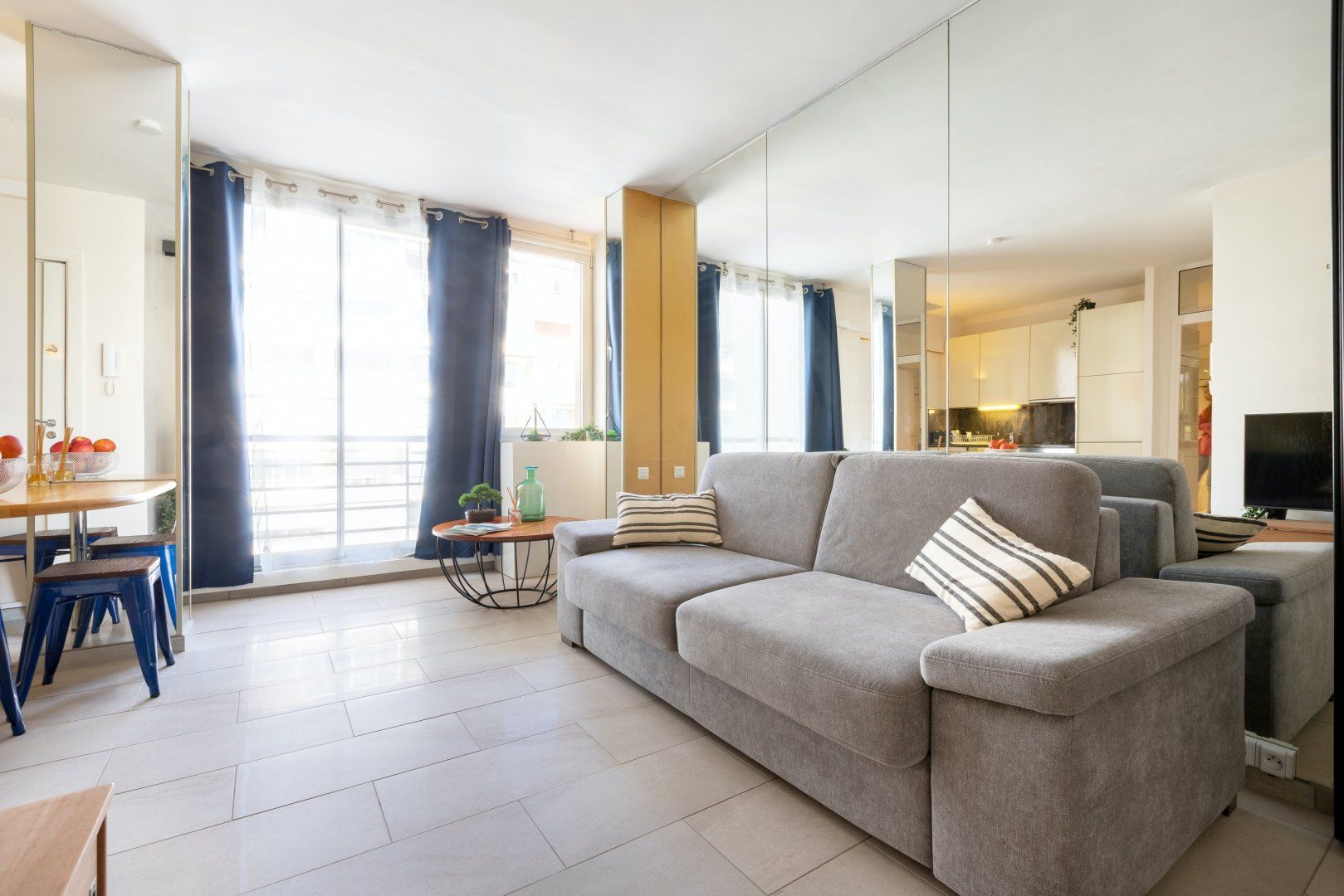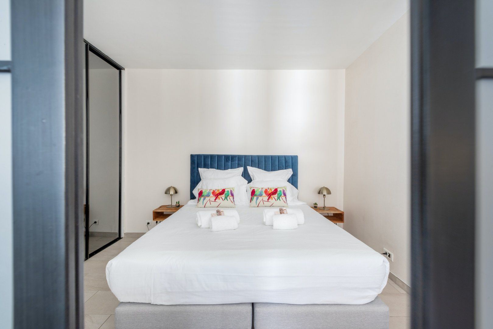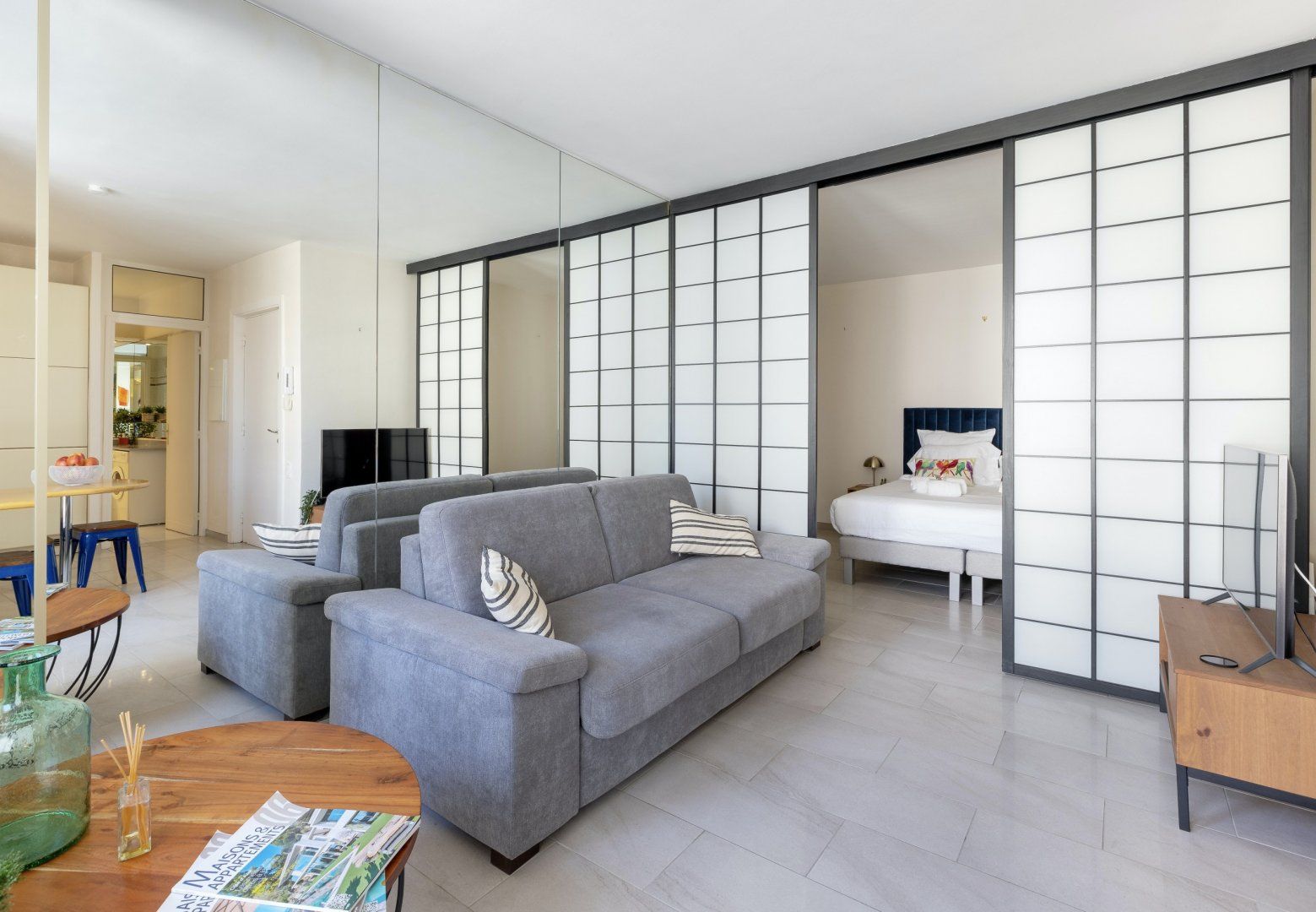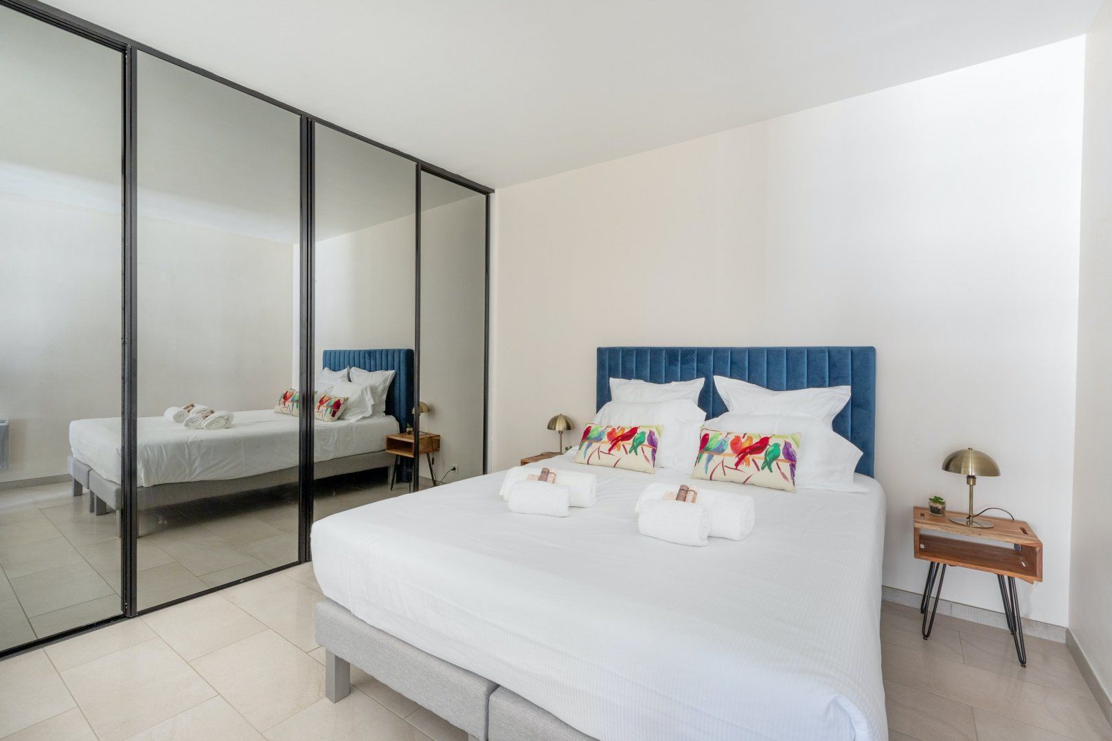 Decorated with casual comfort in mind, the apartment's open layout is designed with socialising in mind. You can even keep up a conversation from bed while your beloved makes the morning coffee in the kitchen. The mirrored wall is a clever touch, helping to bounce the Côte d'Azur sunlight around the room, making it feel even more expansive.