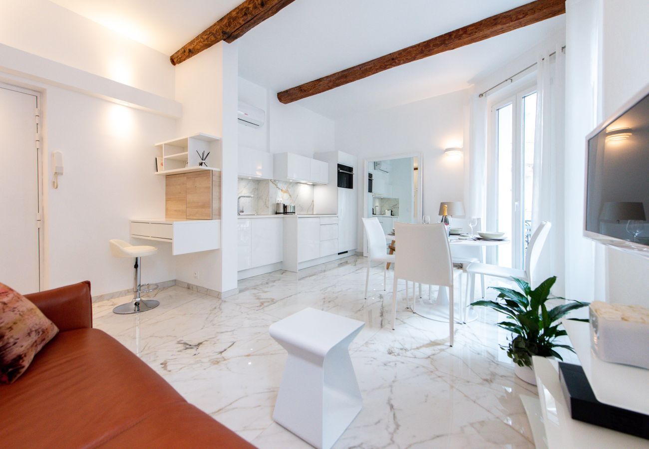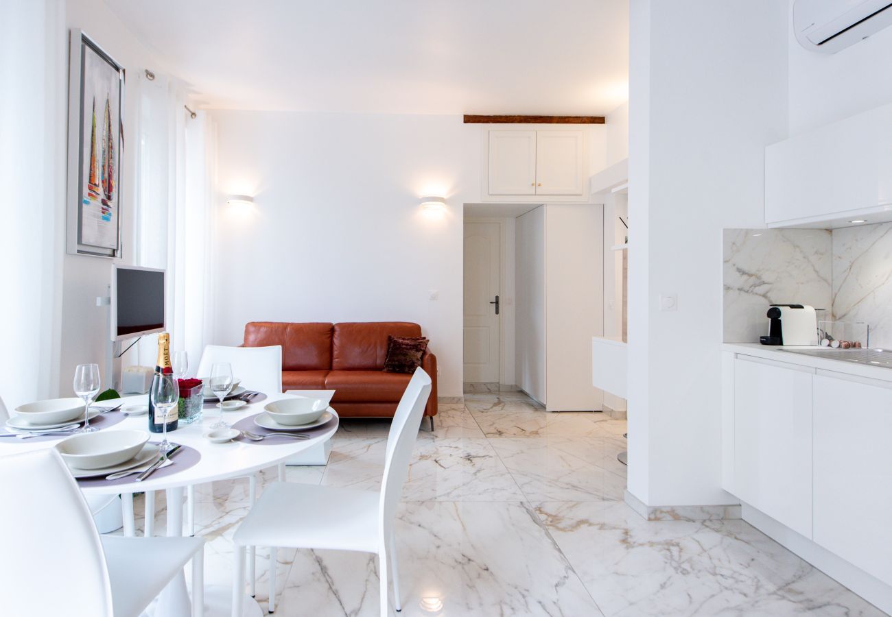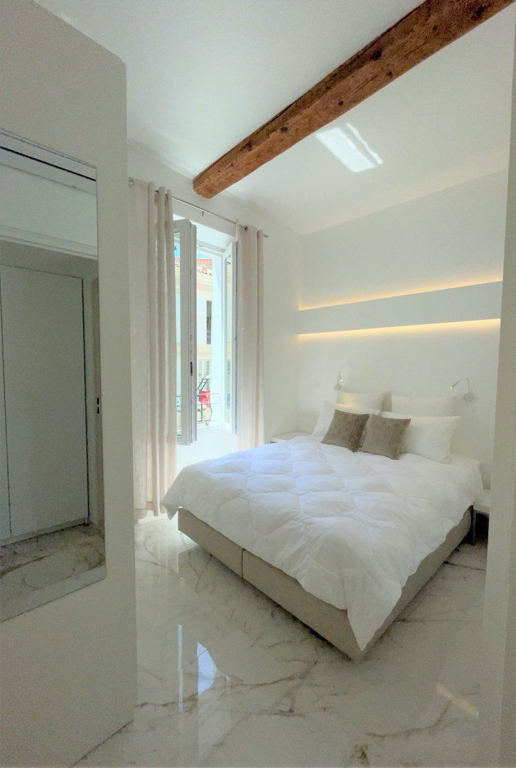 Inside, minimalism is the name of the game with glossy white marble floors, sleek white cabinetry and pared-back decor. We love how much natural light pours in through the French doors – open these up to reveal a small private balcony equipped with a table and chairs. This is the ideal spot to begin mornings over fresh coffee and croissants while people-watching from your privileged position or to enjoy a celebratory sundowner when you’re not out sampling the many trendy bars within easy reach. With a comfy bedroom and a relaxing rainfall shower to wake up to each morning, you’ve got everything you need for a carefree Cannes getaway.