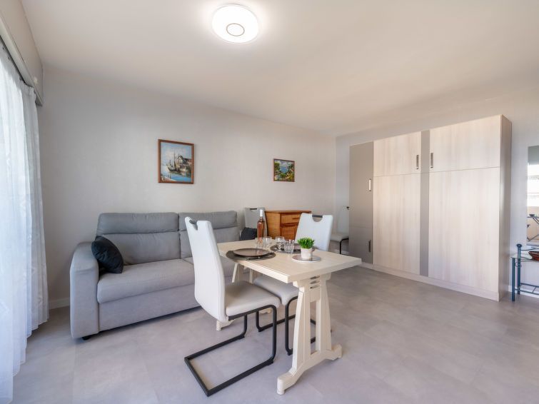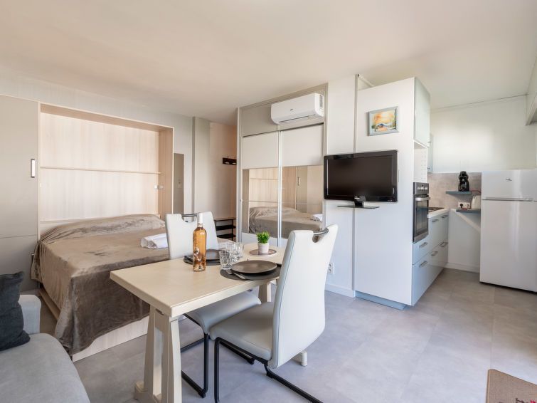 1-room apartment 22 m2 on 2nd floor. Comfortable furnishings: living/dining room with 1 double wall-trunk bed (140 cm, length 190 cm), TV (flat screen), air conditioning. Exit to the terrace. Open kitchen (oven, 4 induction hot plates, toaster, kettle, microwave, freezer, electric coffee machine).