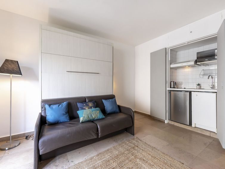 1-room apartment 20 m2 on 1st floor. Partly renovated in 2022, comfortable furnishings: living/dining room with 1 double fold-away bed (1 x 140 cm, length 190 cm), TV (flat screen), air conditioning. Exit to the terrace. Open kitchen (2 ceramic glass hob hotplates, kettle, microwave, electric coffee machine, Capsules for coffee machine (Nespresso) extra).