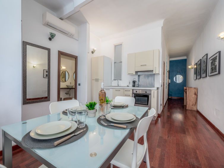 2-room apartment 55 m2 on 3rd floor. Comfortable furnishings: living/dining room with 1 double sofabed (140 cm, length 190 cm), TV, flat screen and air conditioning. 1 room with 1 french bed (140 cm, length 190 cm), air conditioning. Open kitchen (4 hot plates, oven, dishwasher, toaster, kettle, microwave, electric coffee machine, Capsules for coffee machine (Nespresso) extra).