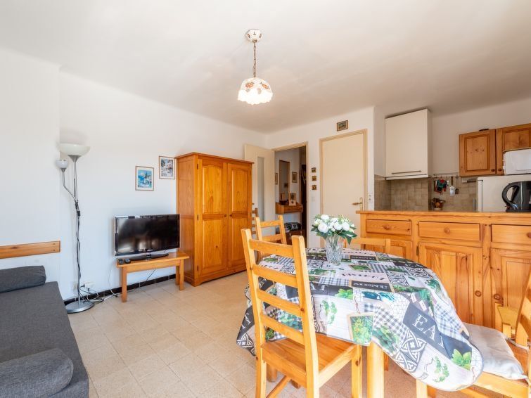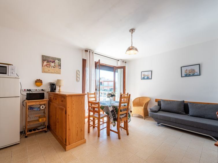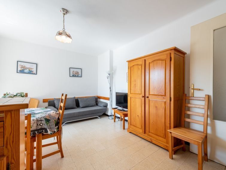 2-room apartment 37 m2 on 3rd floor, south facing position. Practical and comfortable furnishings: living/dining room with 1 double sofabed (140 cm, length 190 cm), TV (flat screen), air conditioning. Exit to the terrace. 1 room with 1 french bed (140 cm, length 190 cm). Kitchenette (oven, 4 ceramic glass hob hotplates, toaster, kettle, microwave, electric coffee machine).