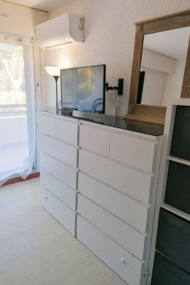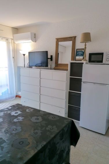1-room studio 23 m2 on 2nd floor. Practical and beautiful furnishings: living room with 1 double sofabed (135 cm, length 185 cm), TV (flat screen), radio and CD-player. Exit to the terrace. Entrance hall with 1 x 2 bunk beds (90 cm, length 190 cm). Kitchenette (4 ceramic glass hob hotplates, toaster, kettle, electric coffee machine, combination microwave).
