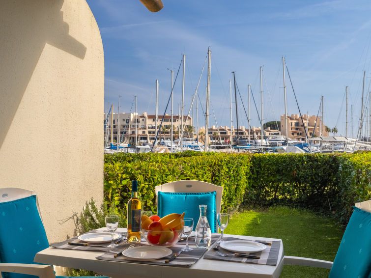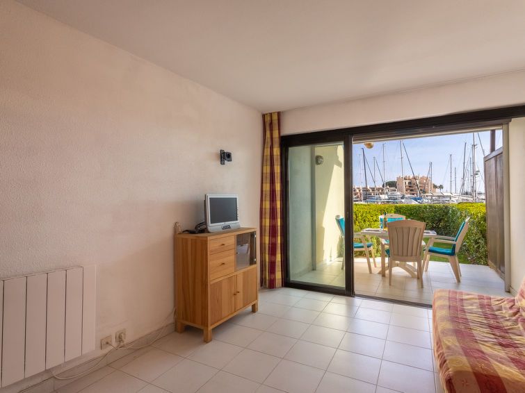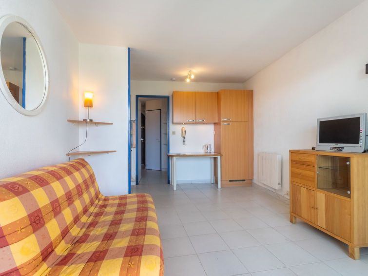 "Les Deux Voiles 4", 2-room apartment 27 m2, on the ground floor. Living/dining room with 1 sofabed (140 cm, length 190 cm), TV (flat screen). Exit to the terrace. 1 room with 1 french bed (140 cm, length 190 cm). Kitchenette (dishwasher, 2 ceramic glass hob hotplates, toaster, kettle, microwave, freezer, electric coffee machine).
