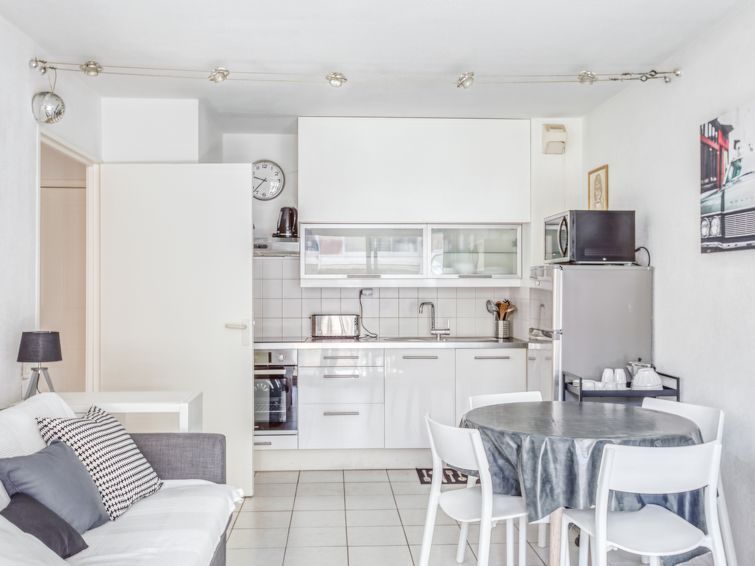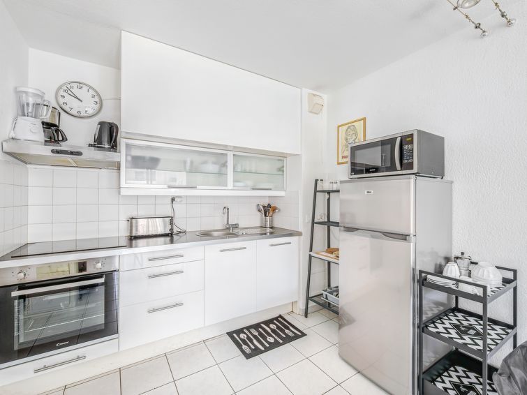 2-room apartment 35 m2 on 1st floor. Living/dining room with 1 double sofabed (1 x 140 cm, length 190 cm), TV and flat screen. Exit to the terrace. 1 room with 1 french bed (1 x 160 cm, length 200 cm), air conditioning. Open kitchen (oven, dishwasher, 3 ceramic glass hob hotplates, toaster, kettle, microwave, freezer, electric coffee machine).