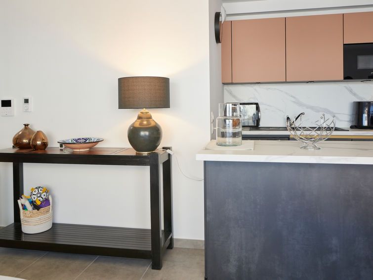 2-room apartment 49 m2 on 4th floor. Comfortable furnishings: living/dining room with 1 sofabed (140 cm, length 200 cm), flat screen, electric heating, air conditioning and electric shutters. Exit to the terrace, north facing position. 1 room with 1 double bed (180 cm, length 200 cm), air conditioning and electric shutters.