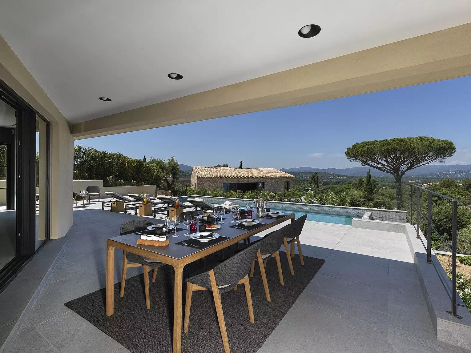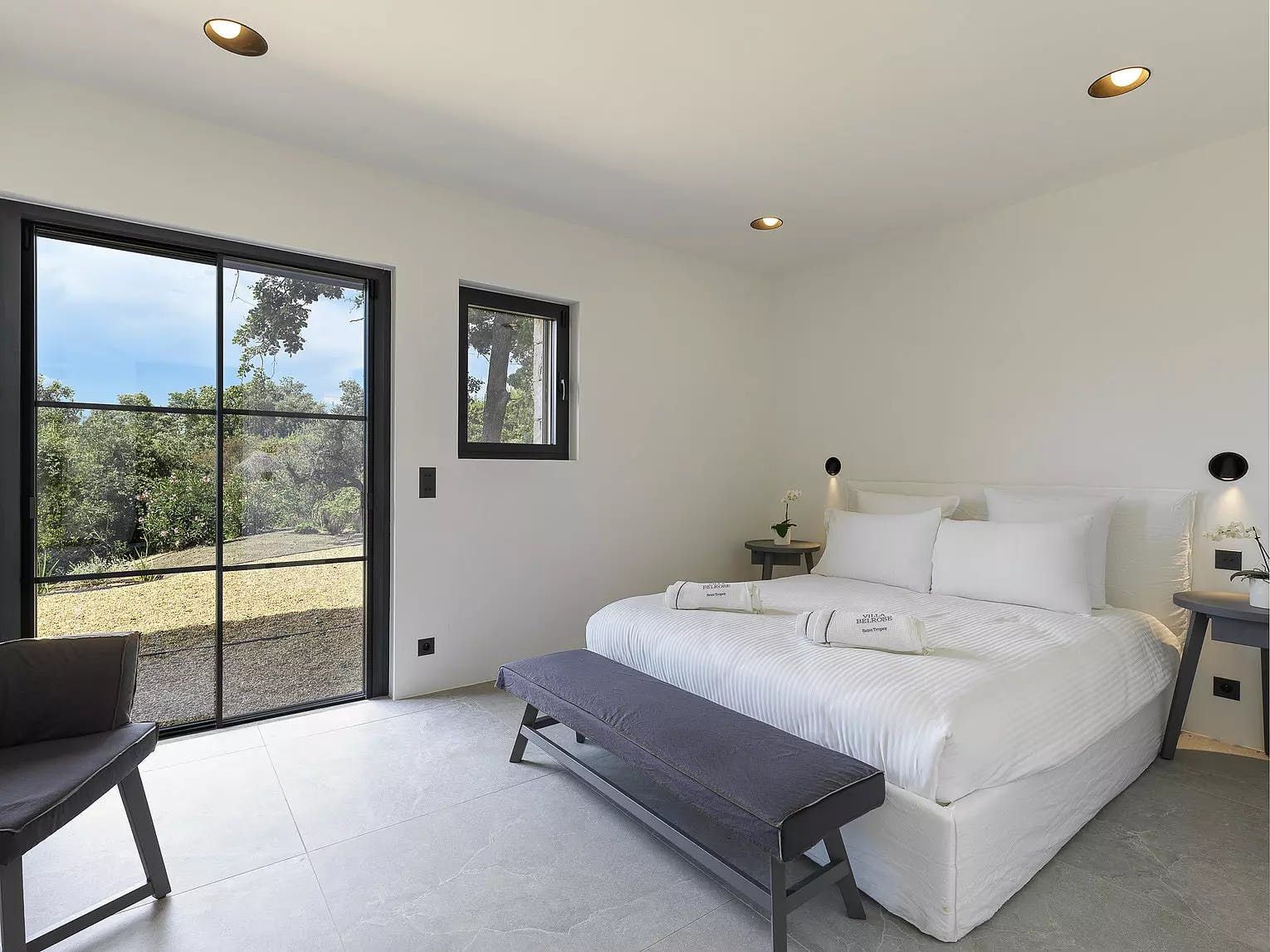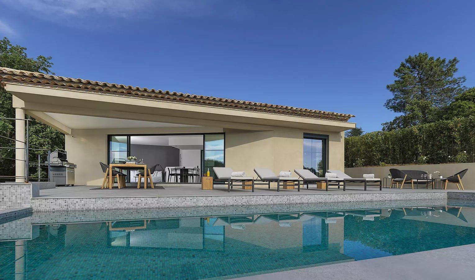 Overlooking Port Grimaud, this modern villa exemplifies coastal living with a touch of luxury. Large rooms and minimalist living spaces give way to a sweeping garden and an infinity pool that'll delight little ones. Here you'll also have your pick of outdoor seating, with everything from an alfresco dining table to sun loungers facing the beautiful natural landscape. But we didn't pick this home just for its looks. Beach lovers will find the sandy shores of Pampelonne about fifteen minutes away. And drive to the Port of St. Tropez in ten.