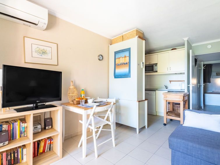 "Les Marines de Gassin 9", 2-room apartment 35 m2, on the ground floor. Simple and comfortable furnishings: living/dining room with 1 sofabed (140 cm, length 190 cm), TV (flat screen), air conditioning. Exit to the garden, to the terrace. 1 room with 2 beds (90 cm, length 190 cm).