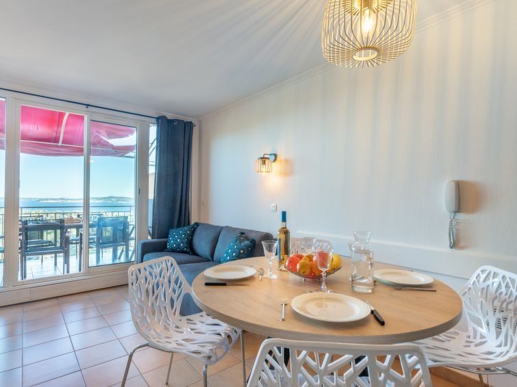 "Les Restanques 8", 3-room apartment 46 m2 on 2 levels. Beautiful furnishings: living/dining room with 1 double sofabed (140 cm, length 190 cm), TV (flat screen). Exit to the balcony. 1 small room with 1 double bed (140 cm, length 190 cm). Kitchenette (dishwasher, 4 ceramic glass hob hotplates, toaster, kettle, microwave, electric coffee machine).