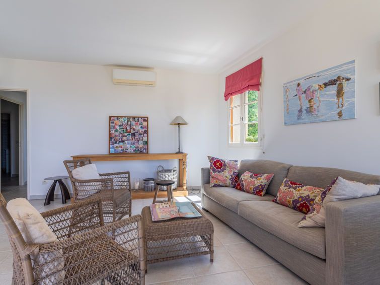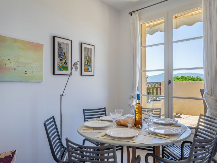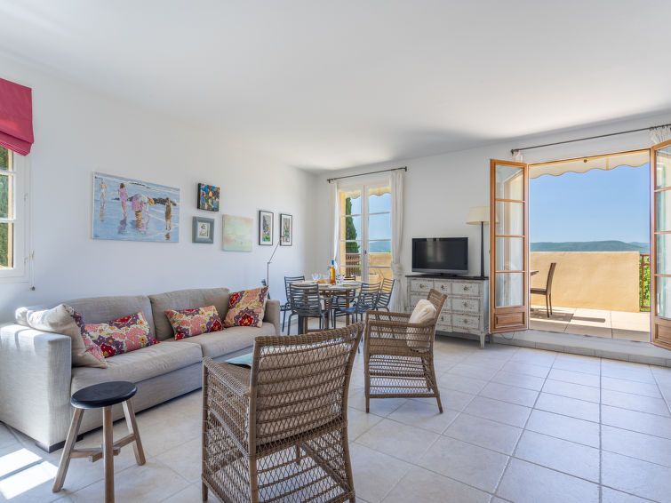 "Les Terrasses de Grimaud 2", 4-room apartment 90 m2. Cosy furnishings: living/dining room with TV (flat screen). Exit to the terrace. 1 room with 1 french bed (160 cm, length 190 cm). 1 room with 1 french bed (140 cm, length 190 cm), shower/WC. 1 room with 2 beds (90 cm, length 190 cm).