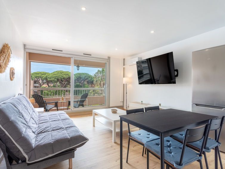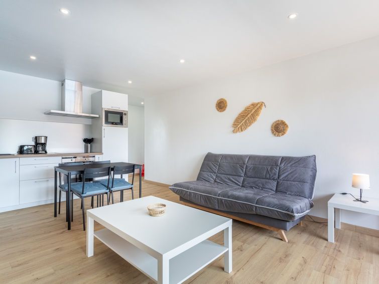 2-room apartment 37 m2 on 3rd floor. Spacious and bright, fully renovated in 2024, modern and cosy furnishings: living/dining room with 1 double sofabed (140 cm, length 190 cm), TV (flat screen). Exit to the terrace. 1 room with 1 french bed (160 cm, length 200 cm). Open kitchen (oven, 3 induction hot plates, toaster, kettle, microwave, freezer, electric coffee machine).