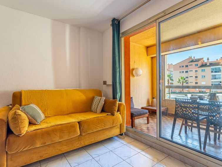 1-room studio 24 m2 on 2nd floor. Comfortable and beautiful furnishings: living/dining room with 1 double sofabed (140 cm, length 190 cm), dining table and TV (flat screen), fan. Exit to the terrace. Entrance hall with 1 x 2 bunk beds (90 cm, length 190 cm). Open kitchen (2 hot plates, dishwasher, toaster, kettle, microwave, electric coffee machine).