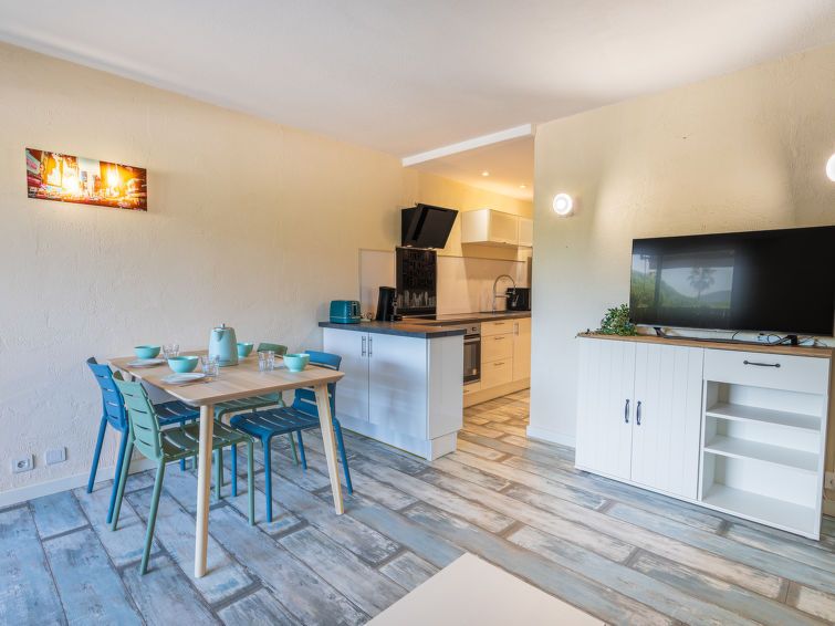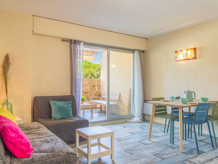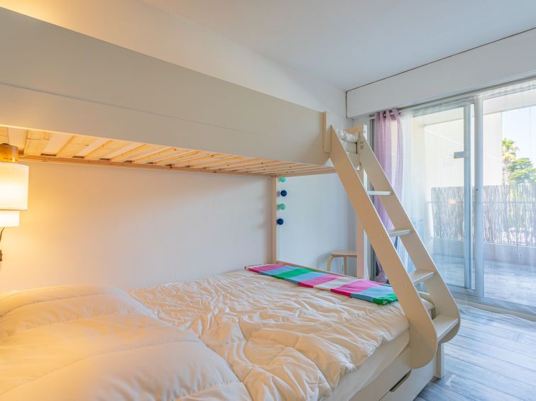 2-room apartment 42 m2 on 1st floor. Spacious and bright, beautiful furnishings: living/dining room with 1 sofabed (160 cm, length 200 cm), dining table and TV (flat screen). Exit to the terrace. Entrance hall with Dressing room. 1 room with 1 x 2 bunk beds (90 cm, length 200 cm) (140 cm, length 200 cm).