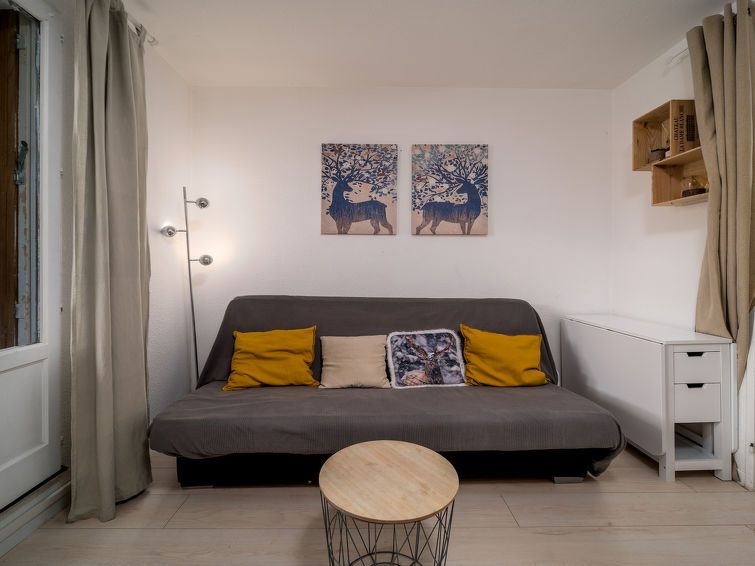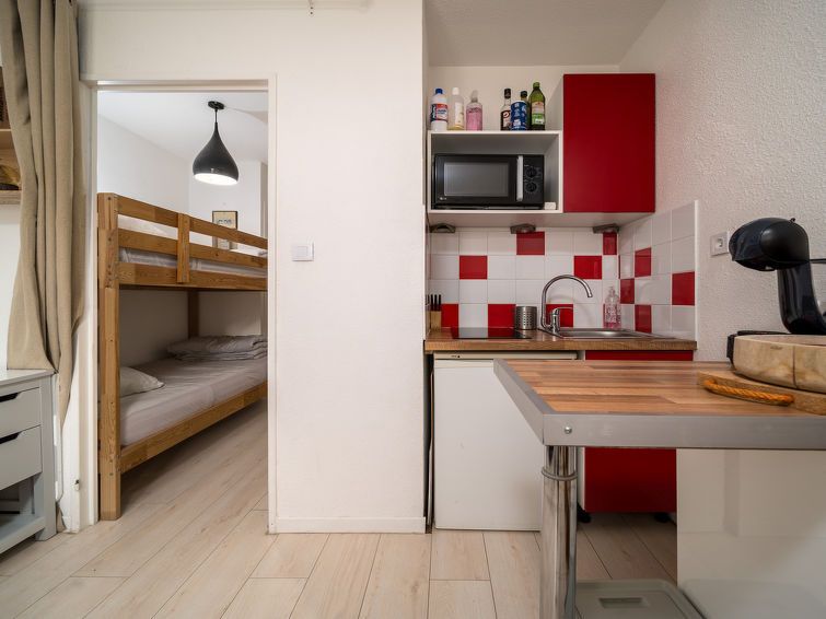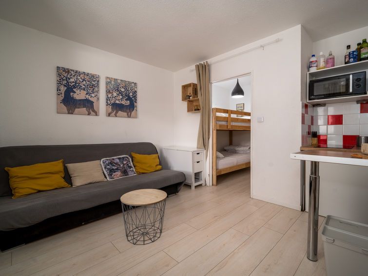 "Les Terrasses de la Foux", 1-room studio 17 m2, on the ground floor. Object suitable for 4 adults. Living room with 1 sofabed and 1 x 2 bunk beds, 1 pull-out bed and TV. Open kitchen (2 hot plates, toaster, kettle, microwave, freezer). Bath/WC. Balcony. View of the mountains. Please note: non-smokers only.