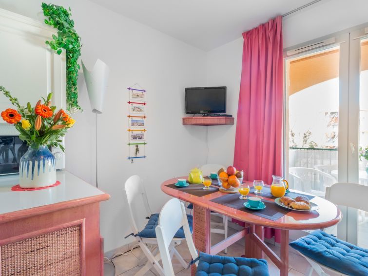 2-room apartment 24 m2 on 1st floor. Bright, beautiful furnishings: living/dining room with dining table and TV (flat screen). Exit to the terrace. 1 room with 1 french bed (140 cm, length 190 cm). Entrance hall with 1 x 2 bunk beds (90 cm, length 190 cm). Kitchenette (mini-oven, oven, 2 induction hot plates, toaster, kettle, microwave, freezer, electric coffee machine).