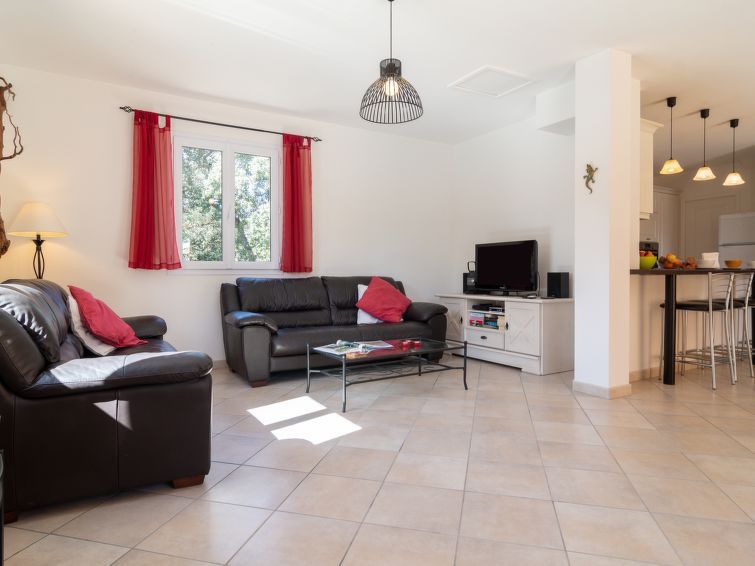 "La Renaudière", 4-room house 110 m2 on 2 levels. Bright, modern and stylish furnishings: large living/dining room with dining table, satellite TV, radio, CD-player and DVD. Exit to the terrace. 1 room with Dressing room with 1 french bed (140 cm, length 190 cm), shower. Exit to the terrace.