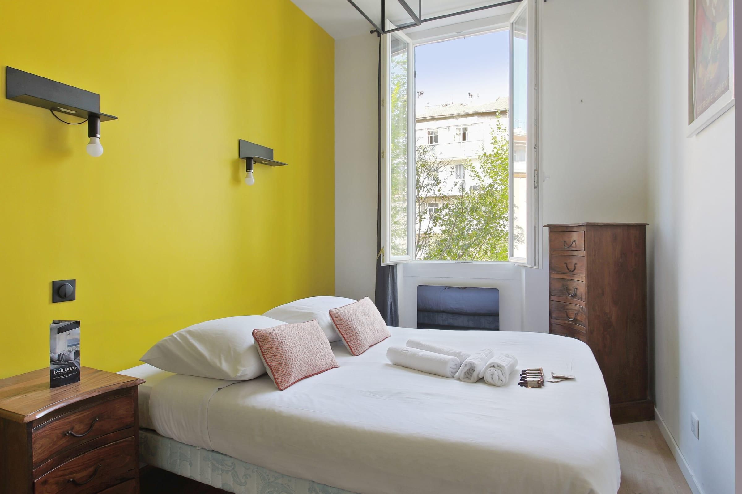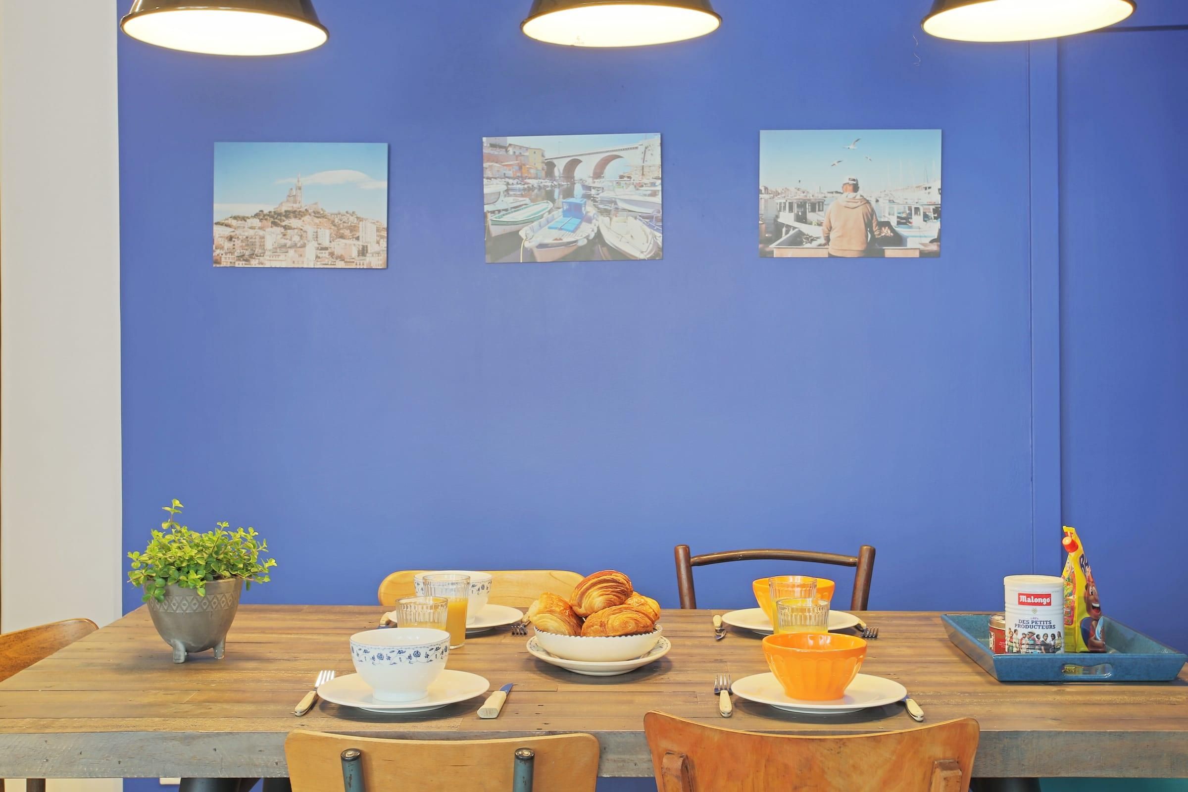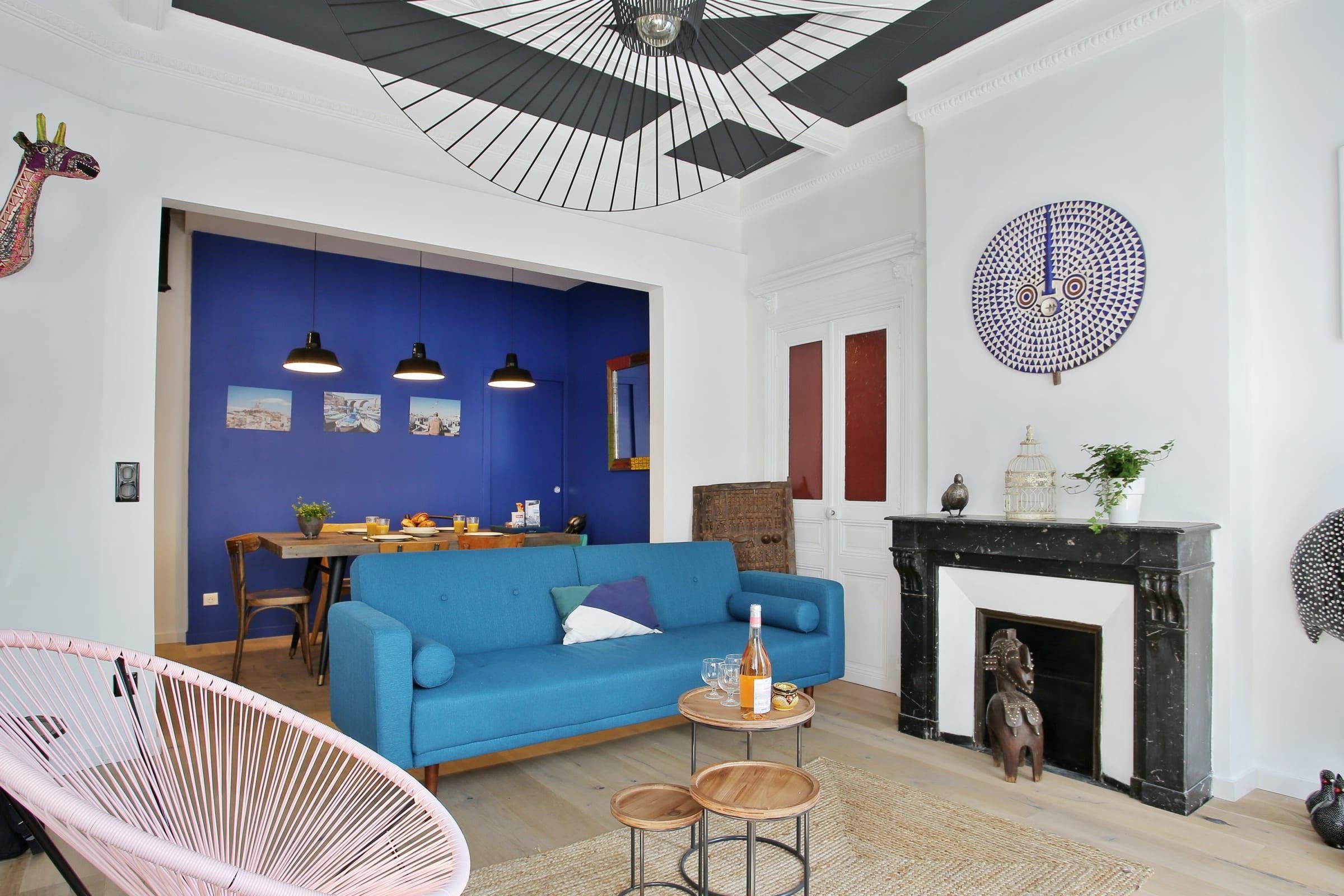 Located in the 5th arrondissement of Marseille, just minutes from the iconic Vieux Port by public transport, this beautiful and calm flat is an ideal base from which to discover Marseille. Bold colours and modern furnishings paint a bright and airy space to relax – we love the contrast between the contemporary furnishings and original French features typical of the city's traditional architecture. From the black marble fireplace to the large wooden dining table and chairs, an air of French chic persists throughout the home despite its quirky range of modern accessories and designs. Location is everything at this spot, as you'll be perfectly positioned to enjoy the best of what the city has to offer. The best way to experience the Mediterranean colours and way of life is by wandering around the charming streets of Marseille and its tourist hotspots on foot. Wind up at the historic Place Castellane, just a nine-minute stroll away, before extending your walk to Cours Julien and eventually ending at Vieux Port. We recommend taking regular pitstops for refreshing cocktails and snack breaks too. Oh, and don't forget to pack some comfortable walking shoes.