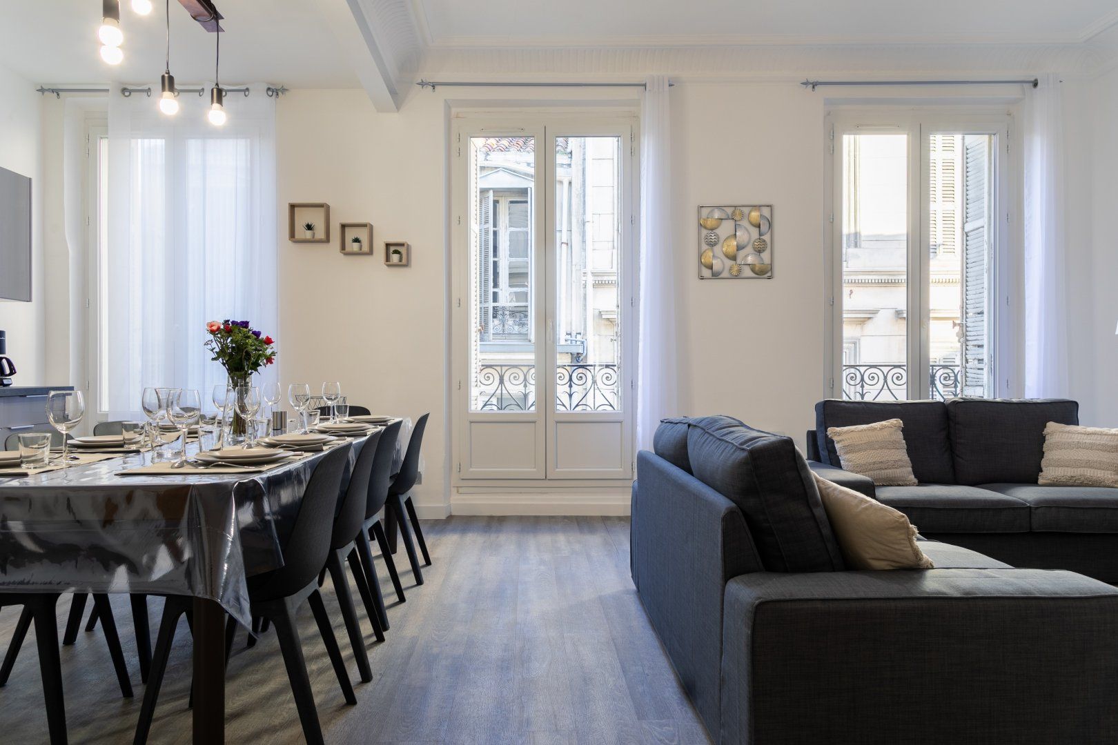 This home is situated within a traditional apartment building but features a contemporary design. The open plan living and dining space was created to allow seamless socialising and is perfect for relaxing in whilst dinner is being prepared. Once it's ready, enjoy your French feast on the ten-seater dining table, ideal for hosting friends and family.