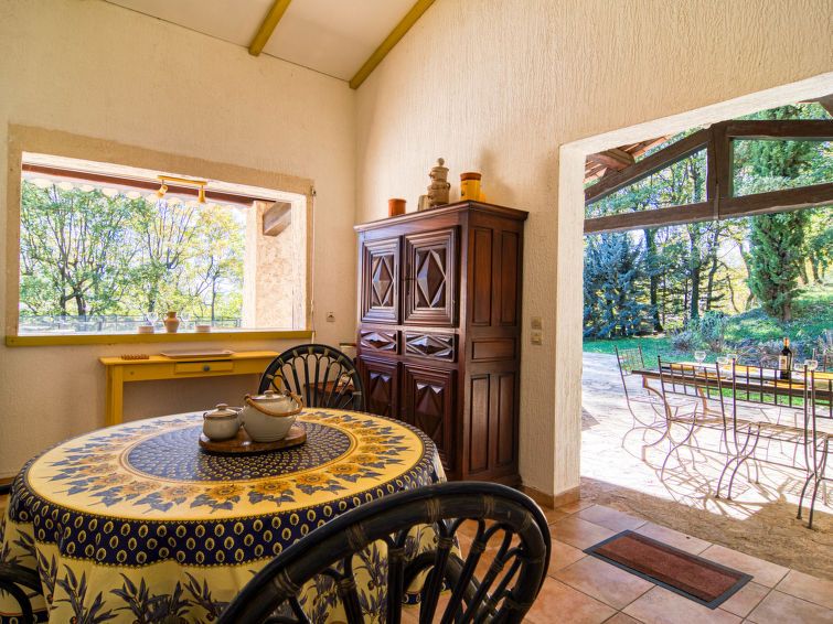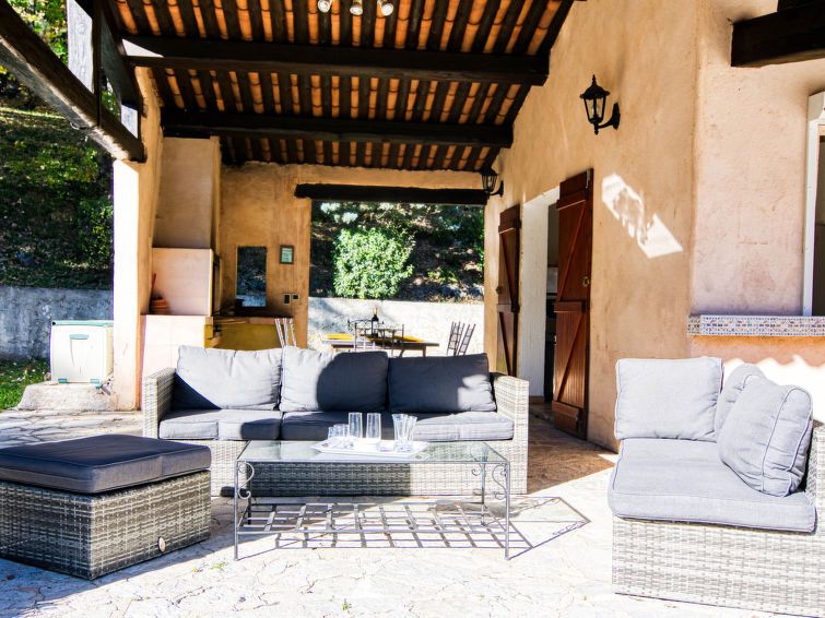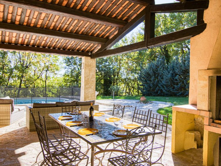 "VIlla Camille", 5-room villa 200 m2. Practical furnishings: living/dining room with open-hearth fireplace, dining table and TV (flat screen). Exit to the terrace. 2 rooms, each room with 1 french bed (140 cm, length 190 cm). 1 room with 2 beds (90 cm, length 190 cm). 1 room with 1 french bed (160 cm, length 200 cm).