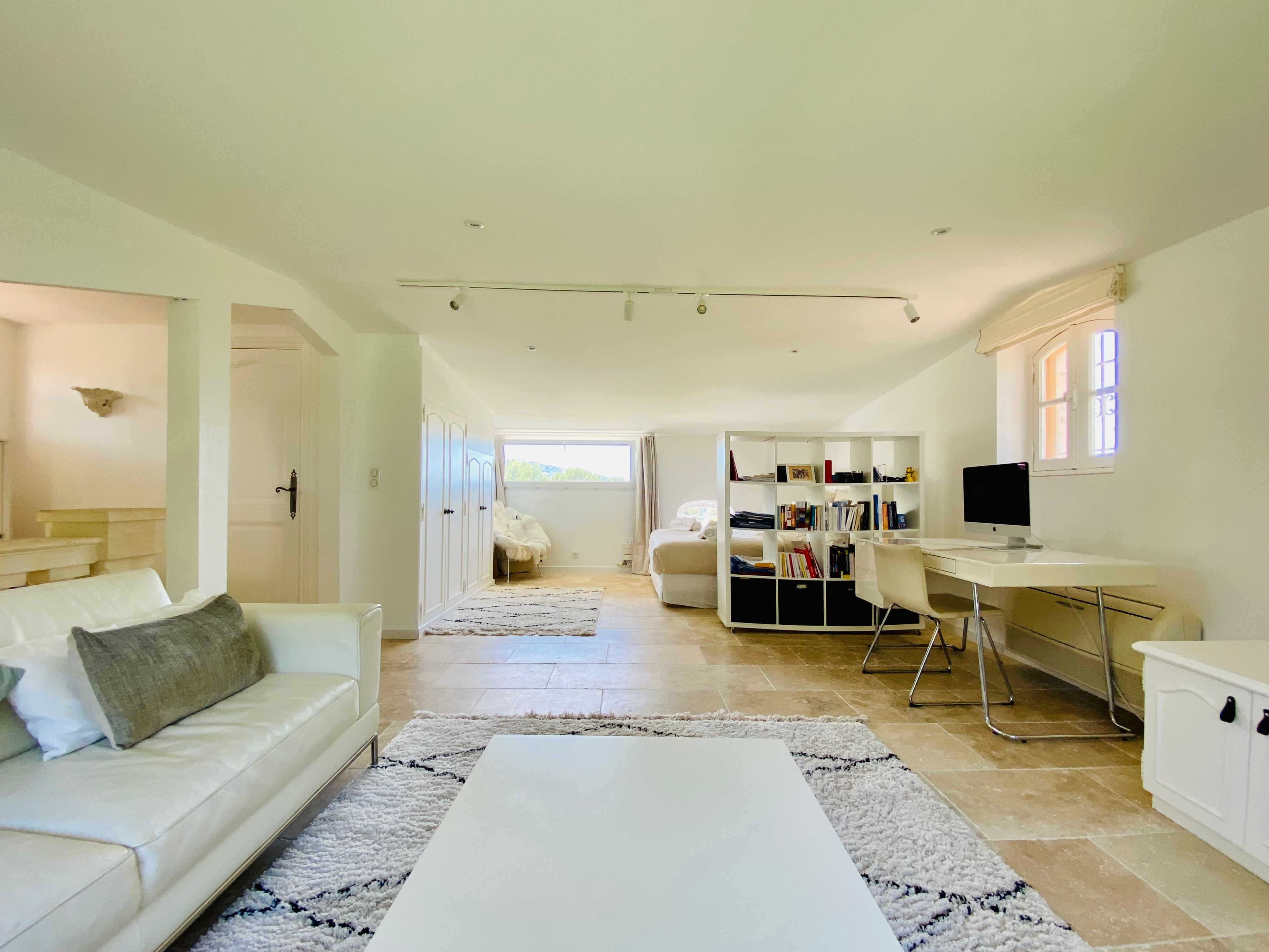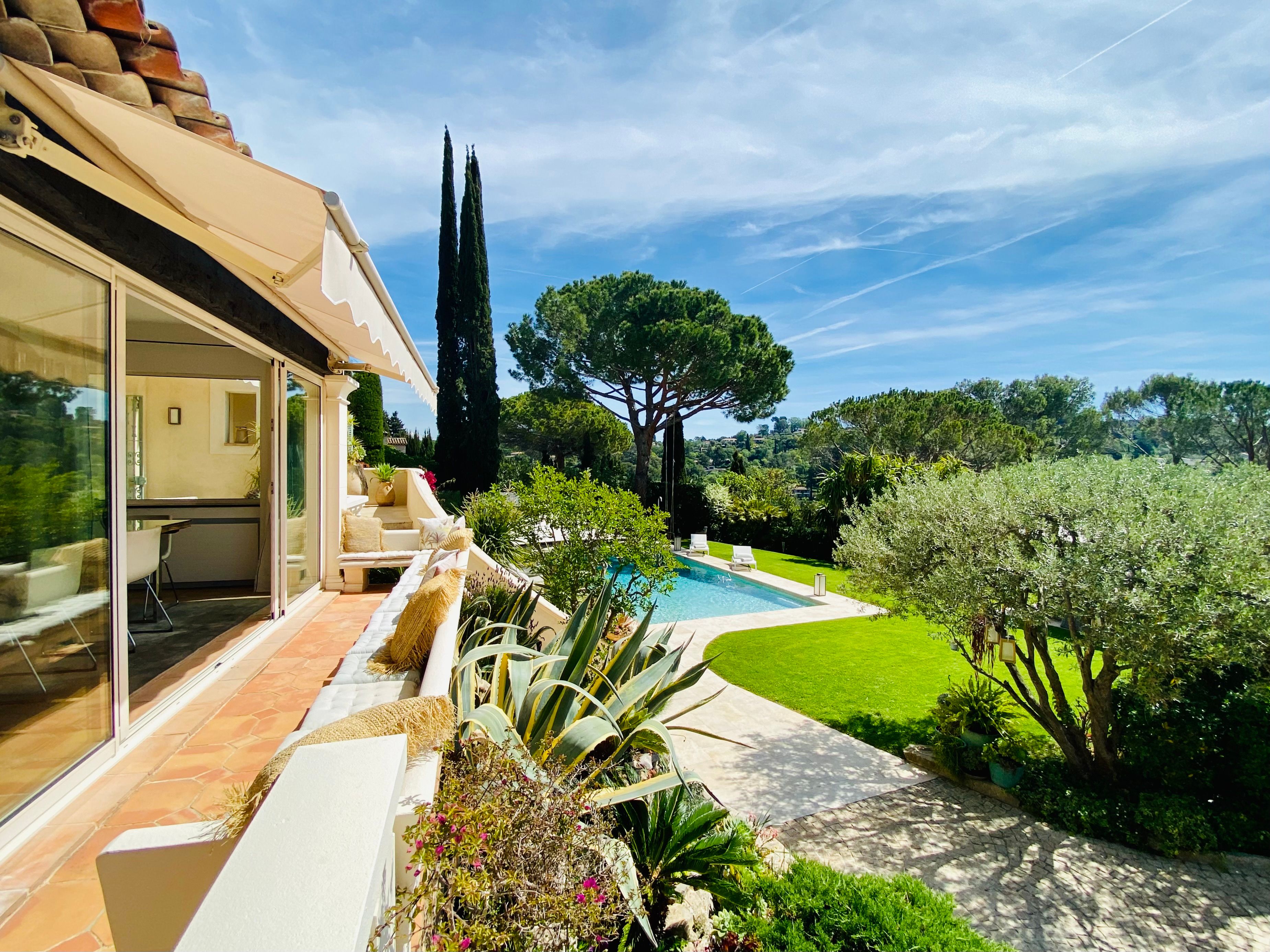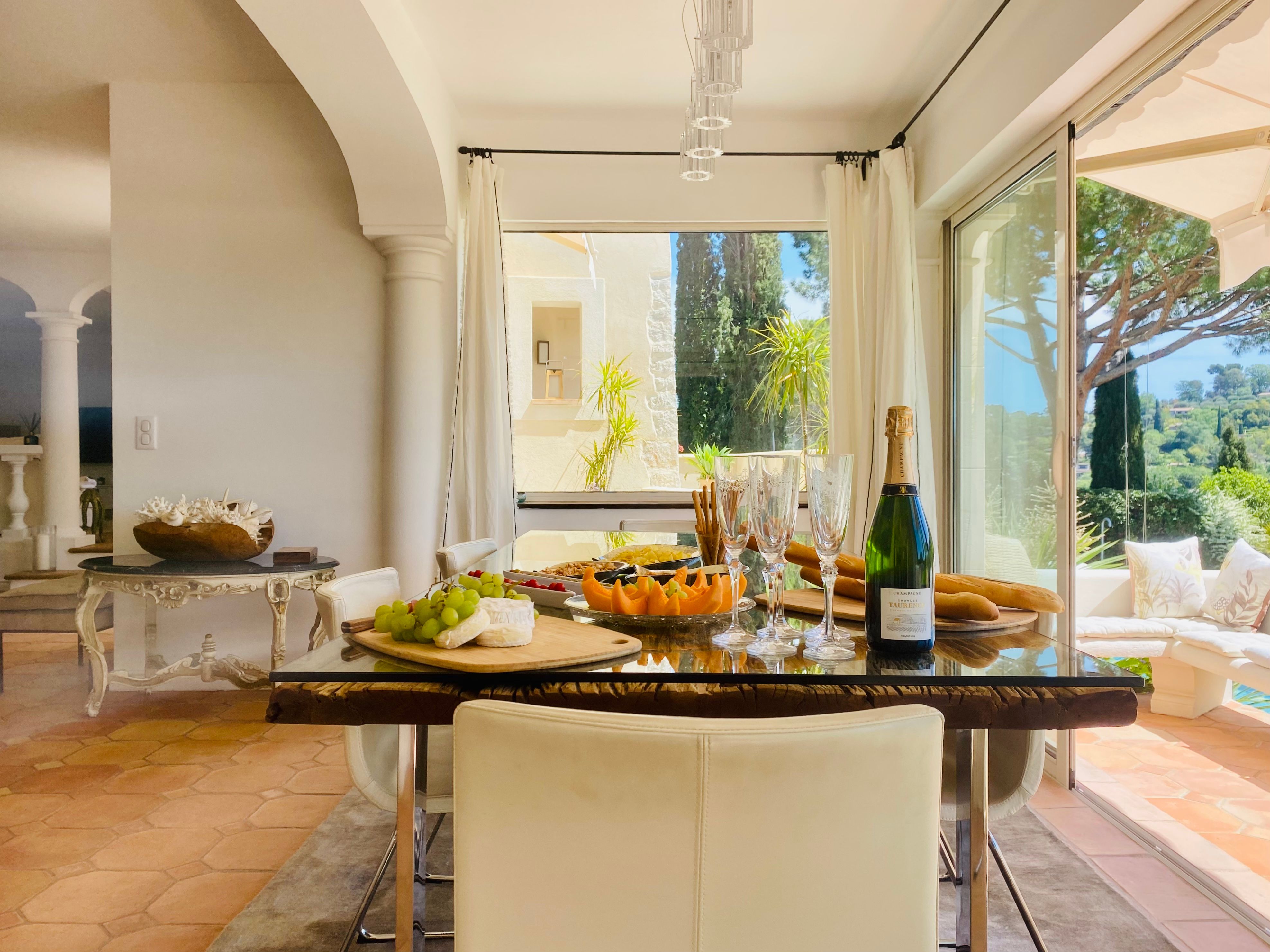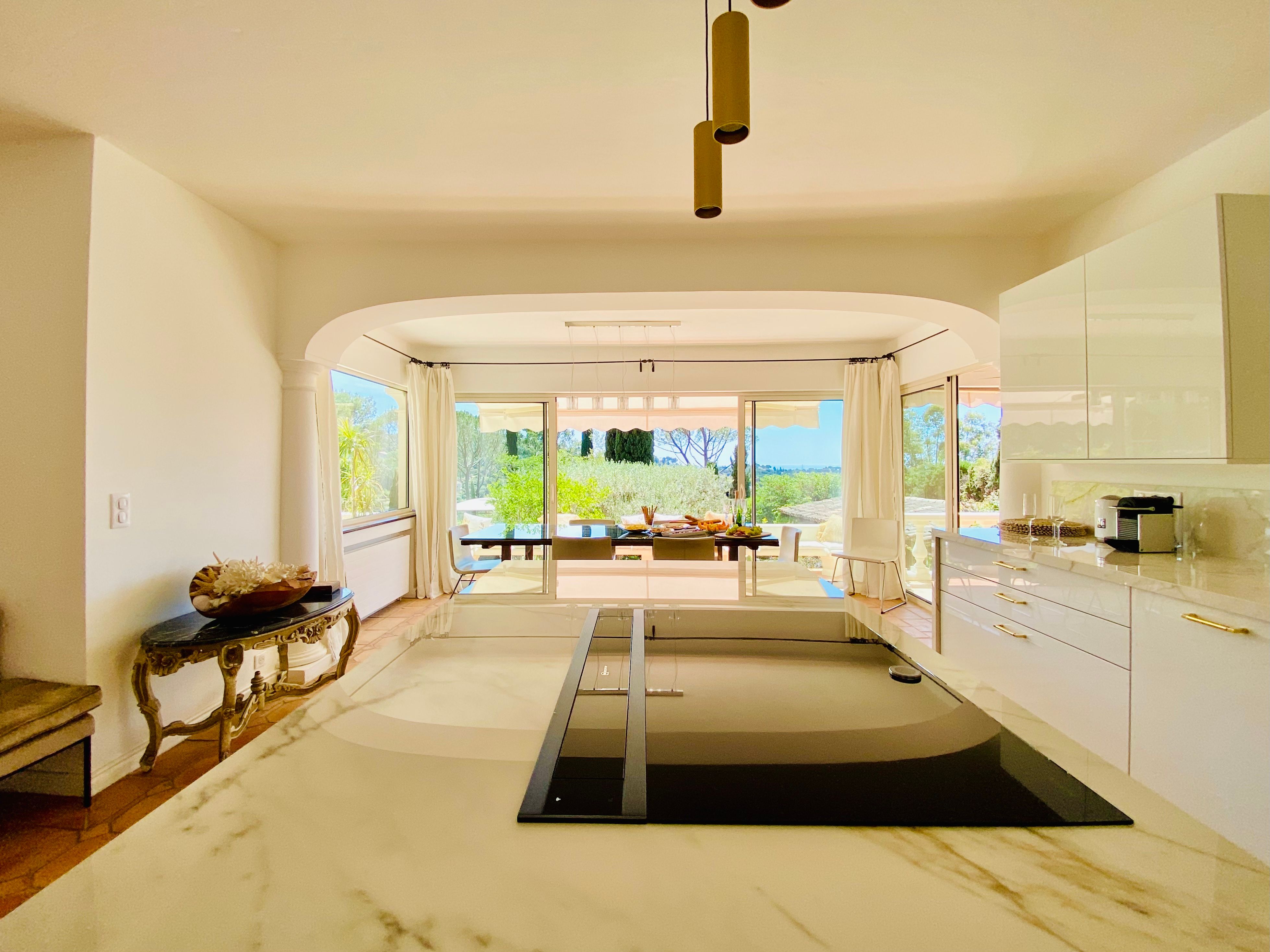 Not only is this villa a lavish spot for group gatherings, but it’s also a short walk from the beautiful historic centre of Mougins where you’ll find restaurants, bars and numerous art galleries. The villa has a series of terraces and patios, home to sunny dining spots, outdoor lounges and a private swimming pool. Inside, you can choose to hang out in the plush main lounge or more casual space at garden level which acts as the fourth bedroom. The kitchen is sleek and modern and glass sliding doors by the dining table show off a view of the greenery around you.