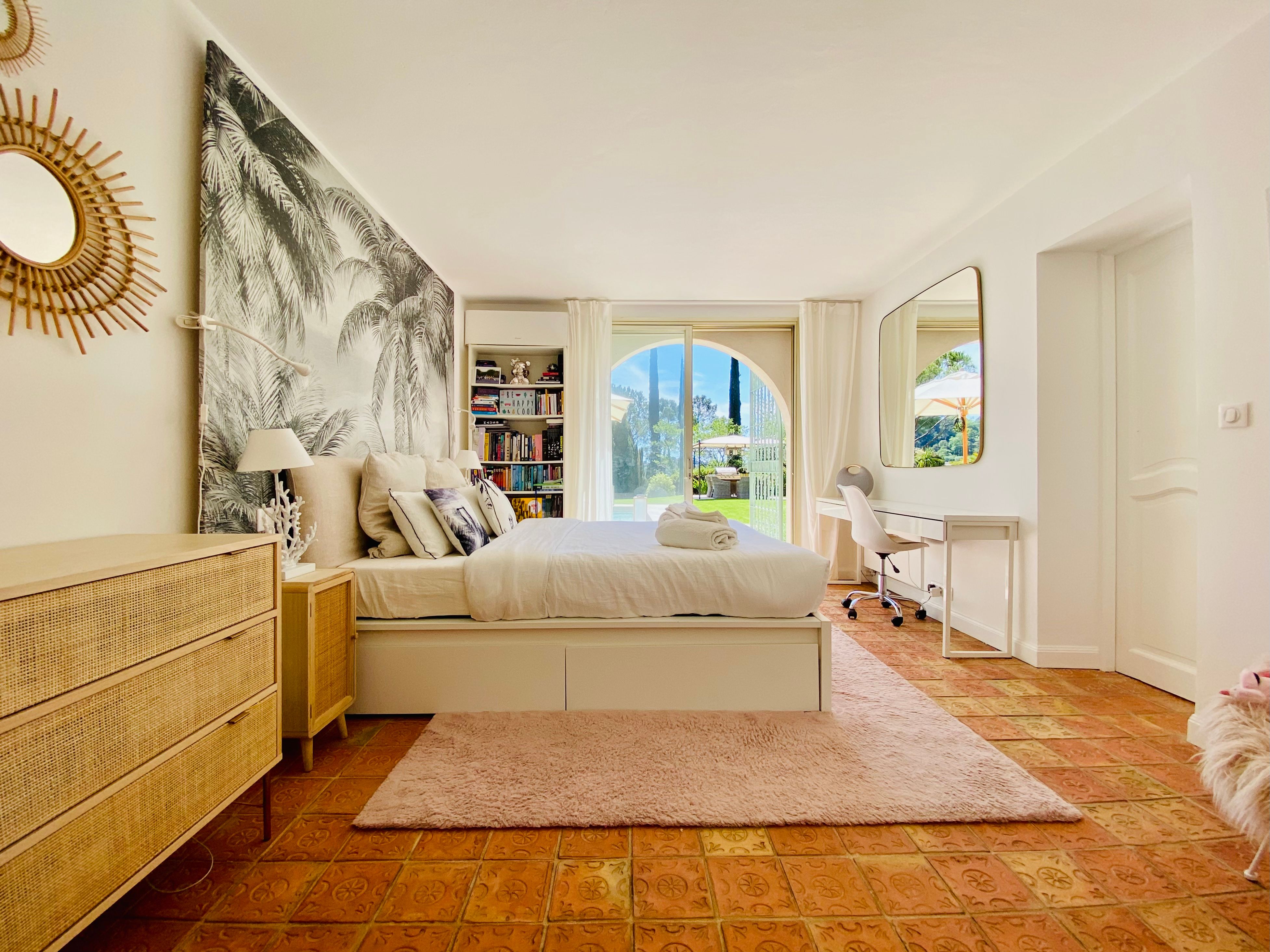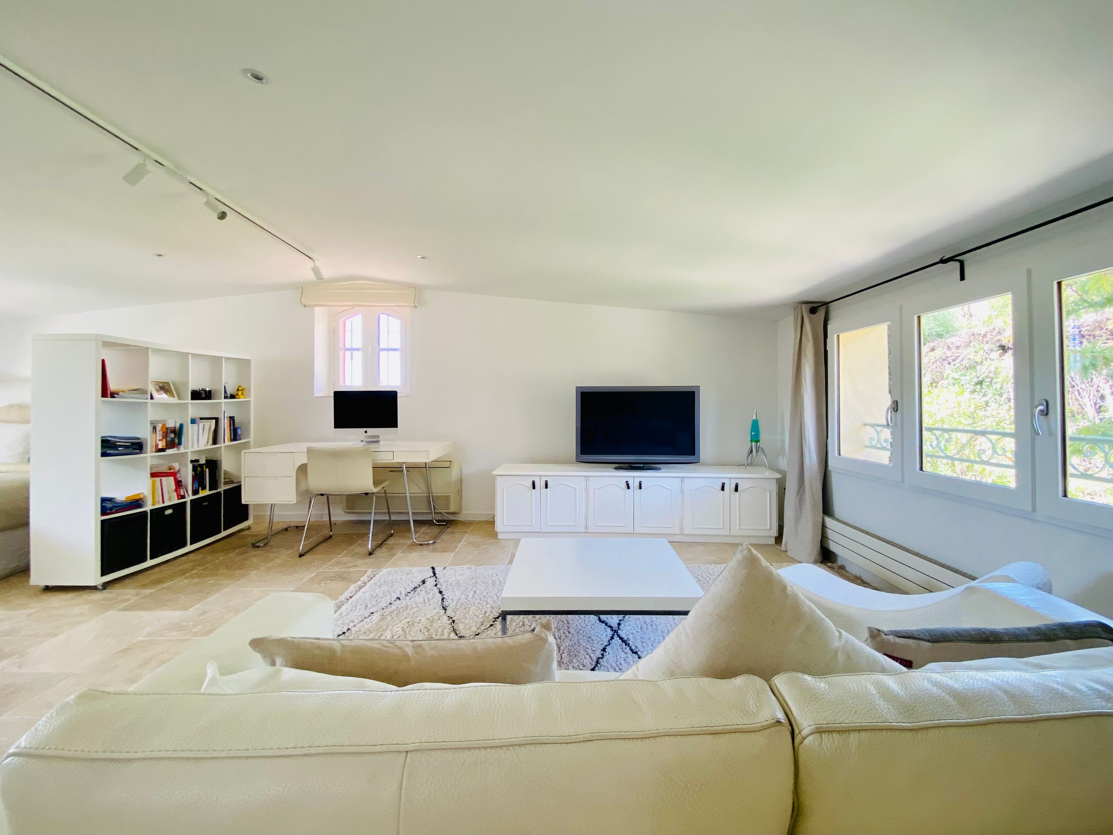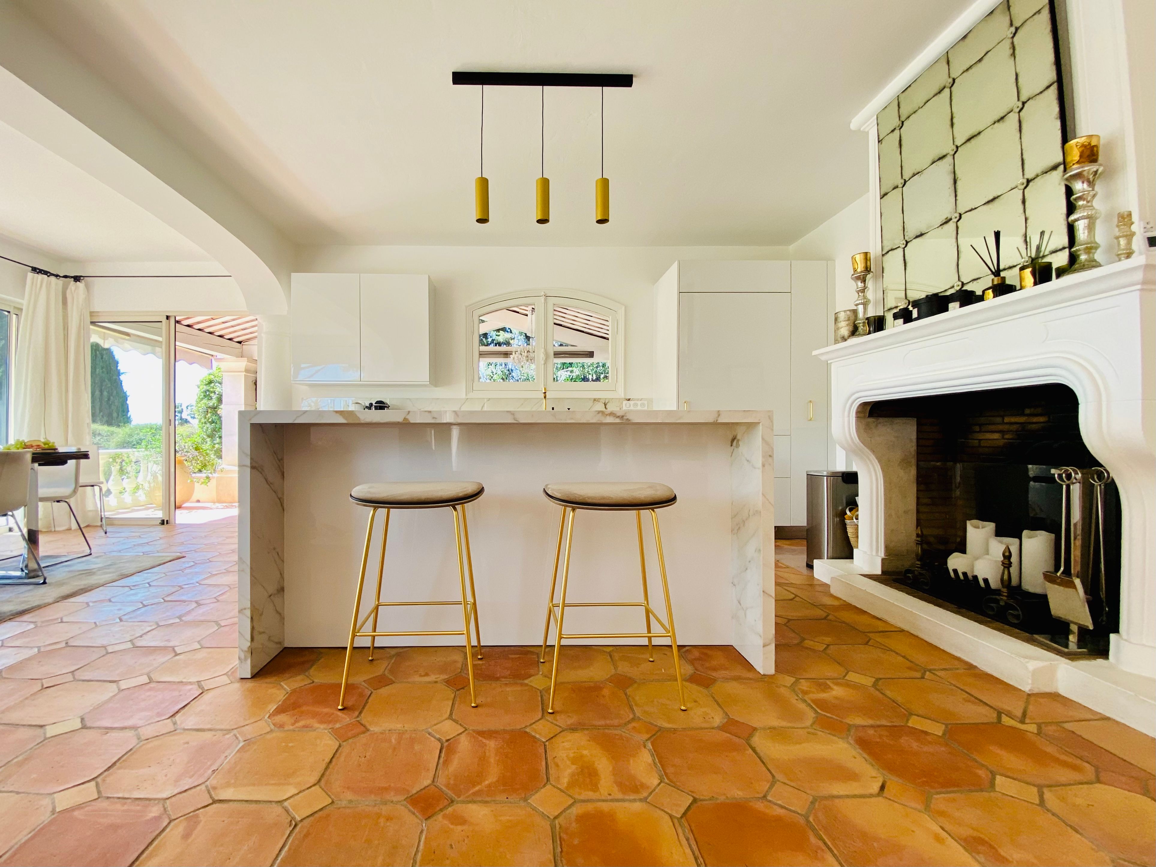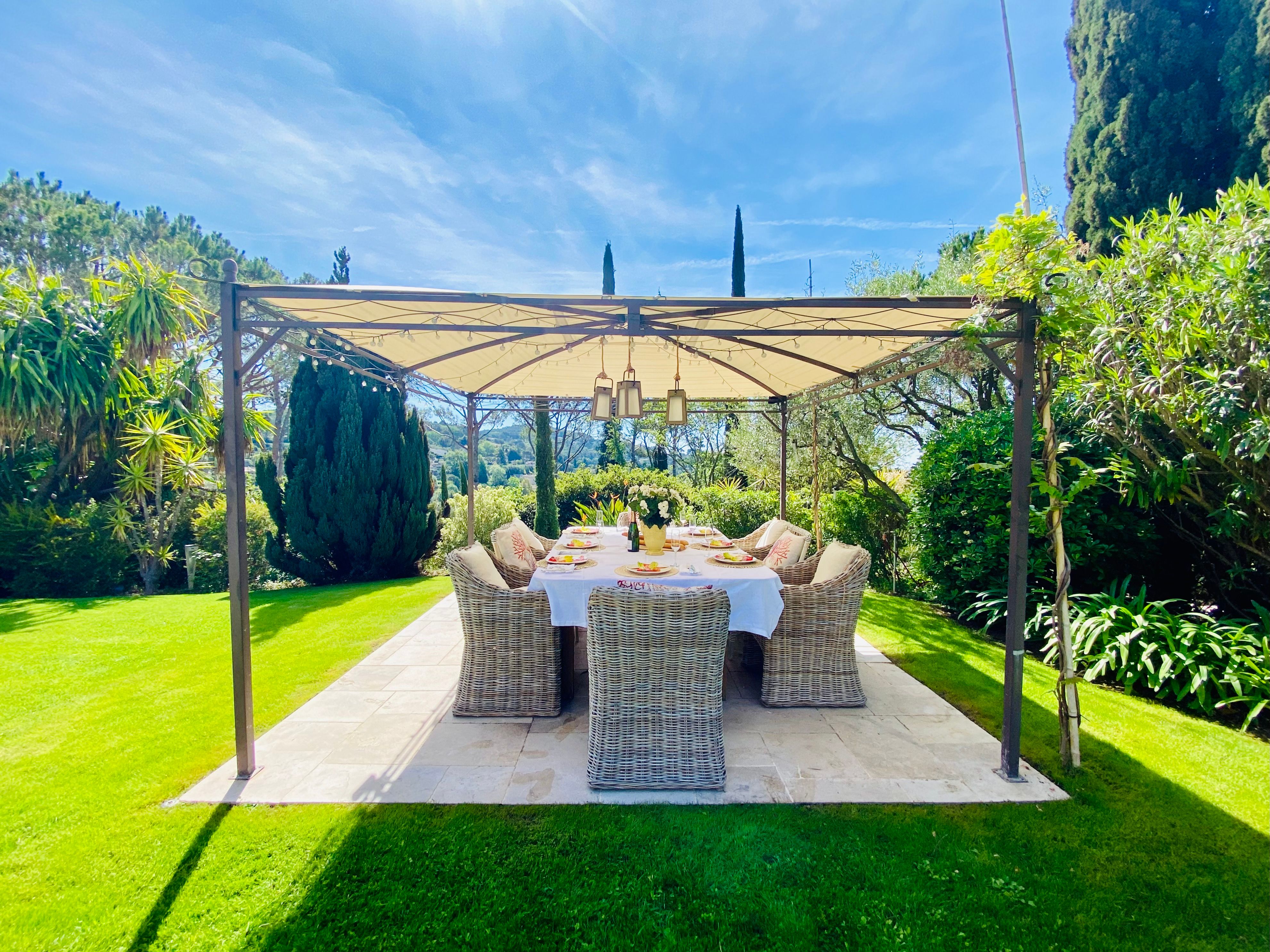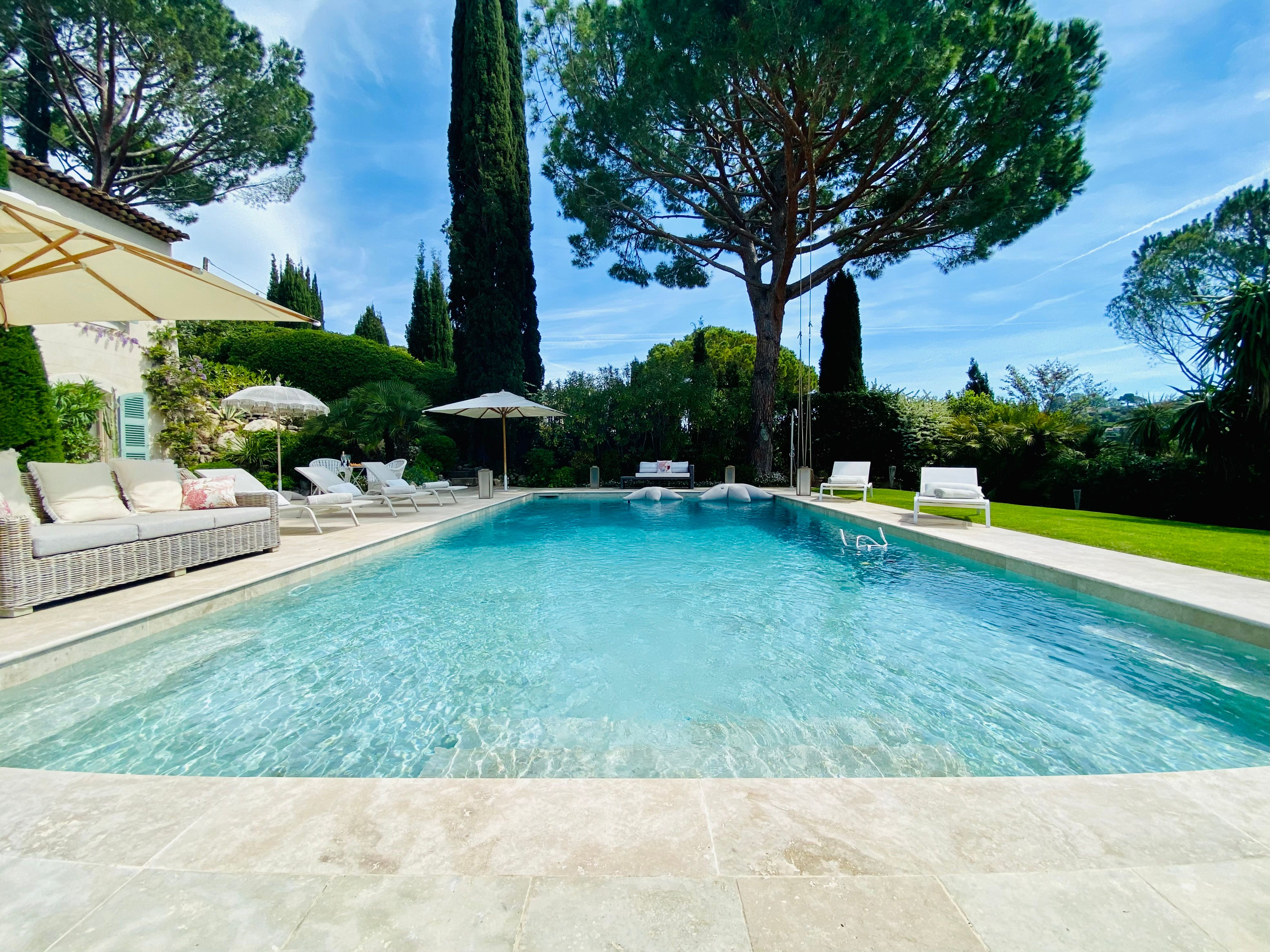Not only is this villa a lavish spot for group gatherings, but it’s also a short walk from the beautiful historic centre of Mougins where you’ll find restaurants, bars and numerous art galleries. The villa has a series of terraces and patios, home to sunny dining spots, outdoor lounges and a private swimming pool. Inside, you can choose to hang out in the plush main lounge or more casual space at garden level which acts as the fourth bedroom. The kitchen is sleek and modern and glass sliding doors by the dining table show off a view of the greenery around you.