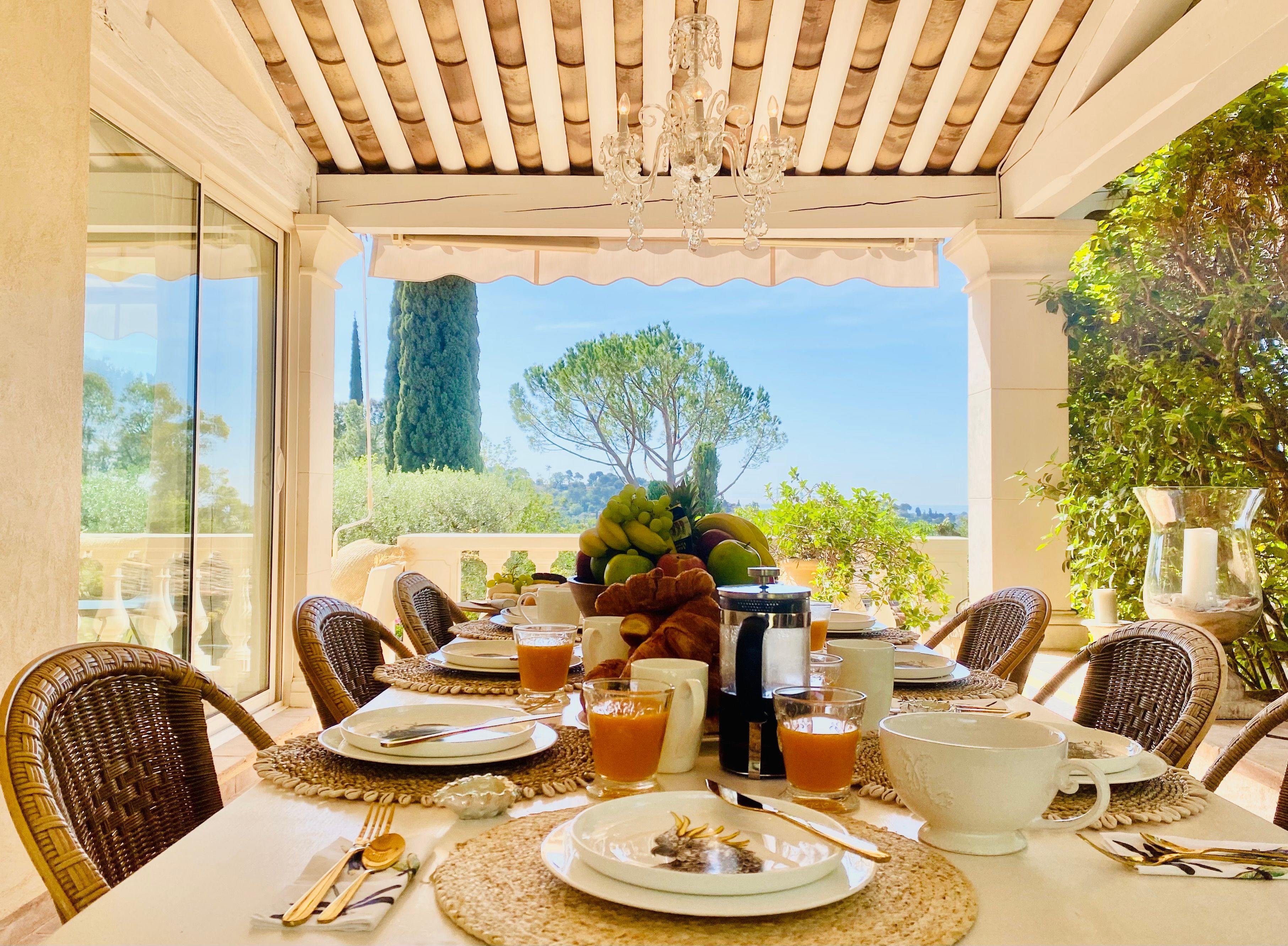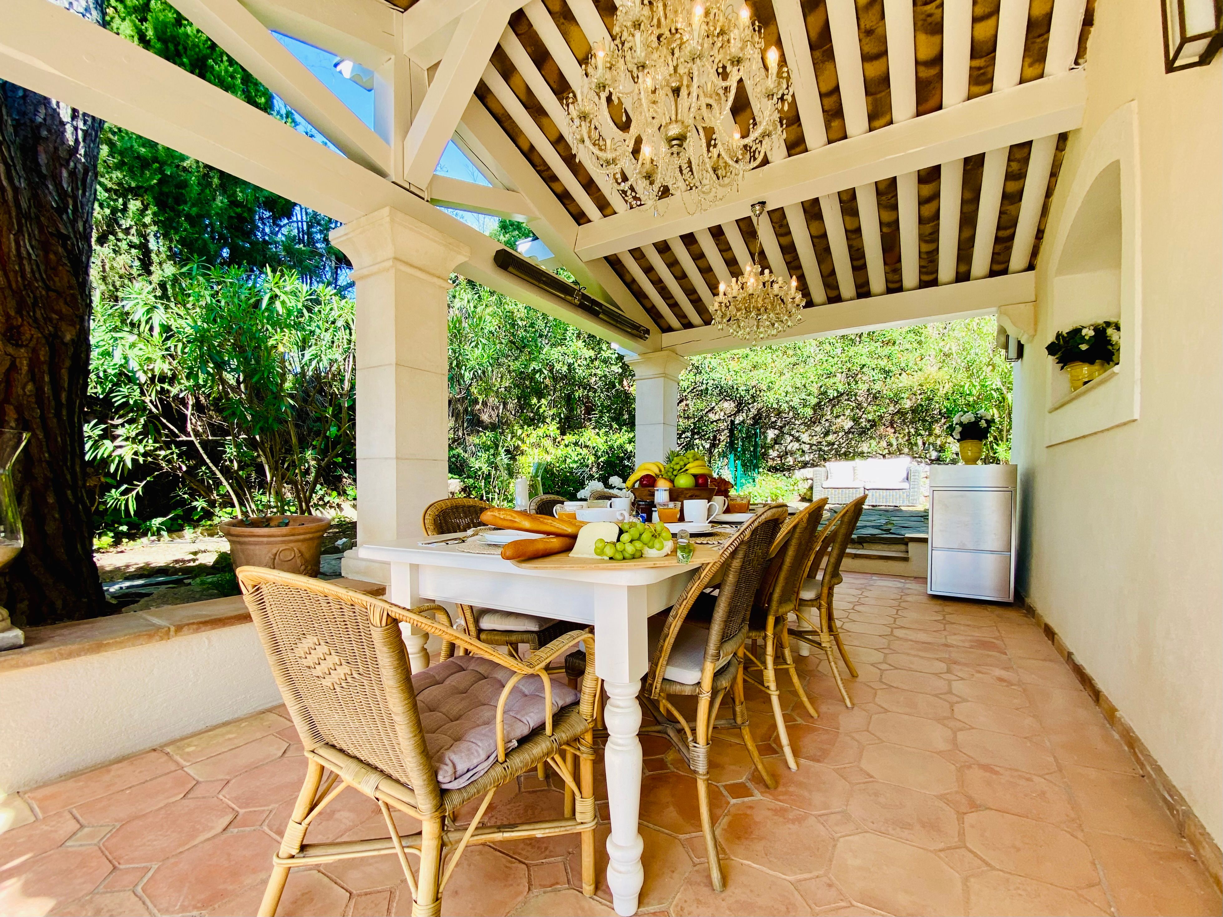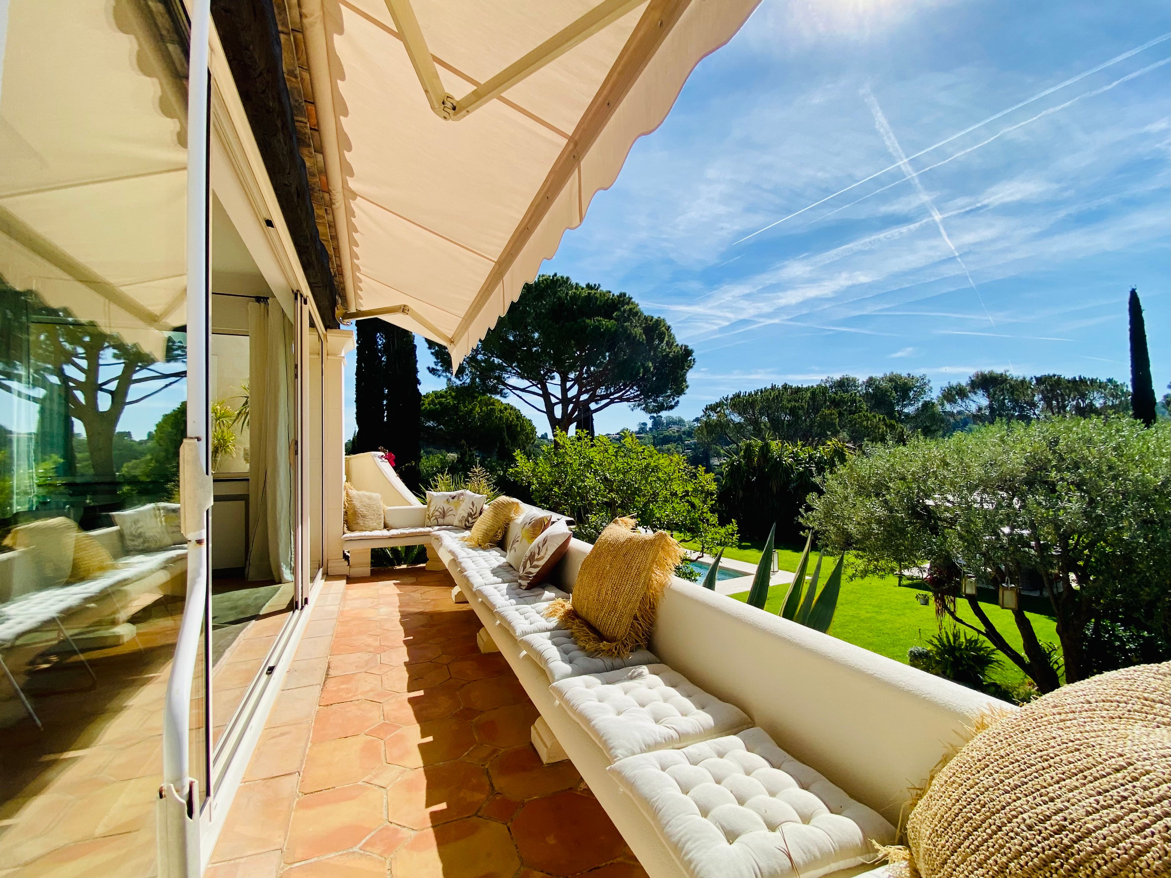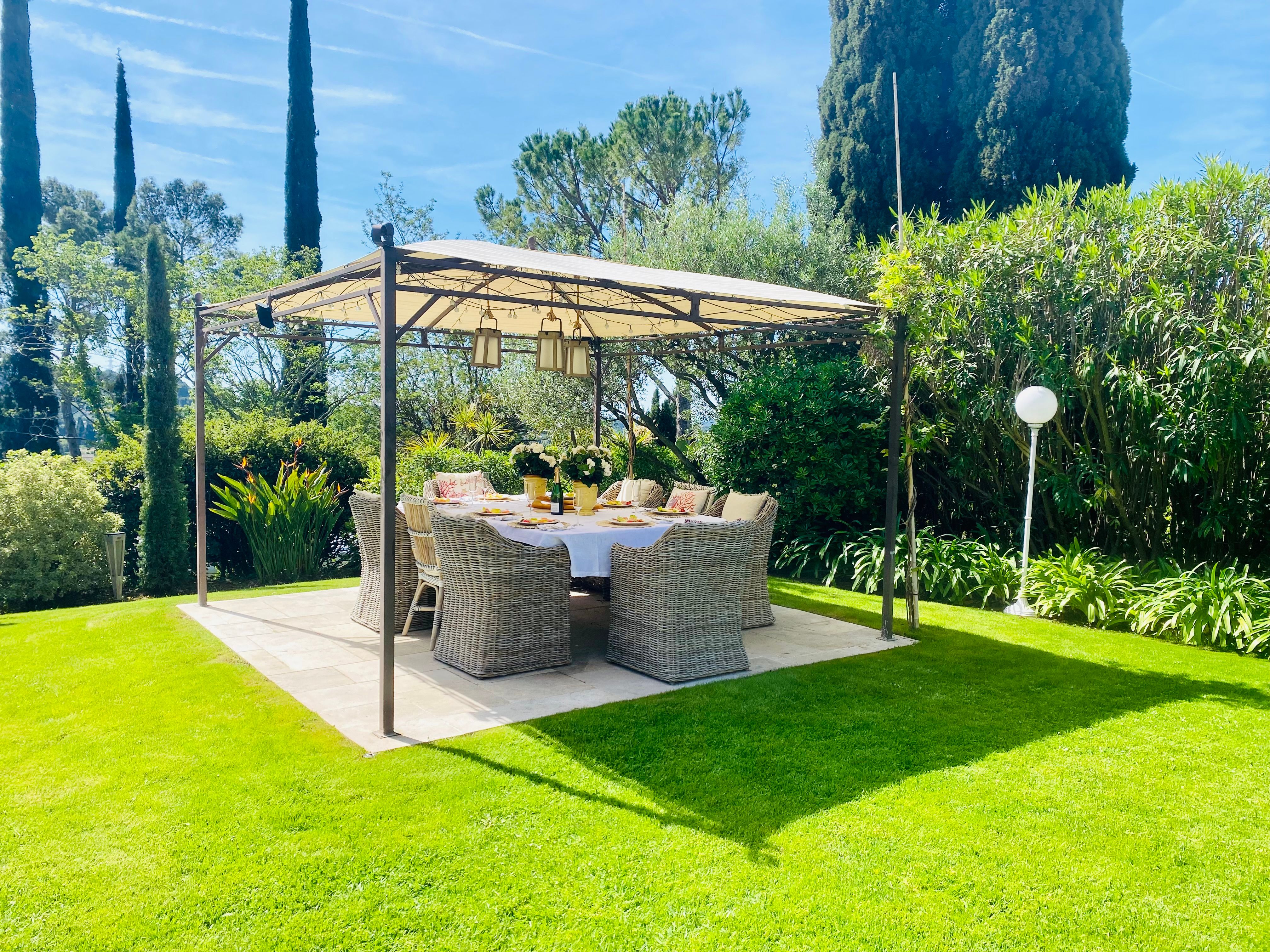 Not only is this villa a lavish spot for group gatherings, but it’s also a short walk from the beautiful historic centre of Mougins where you’ll find restaurants, bars and numerous art galleries. The villa has a series of terraces and patios, home to sunny dining spots, outdoor lounges and a private swimming pool. Inside, you can choose to hang out in the plush main lounge or more casual space at garden level which acts as the fourth bedroom. The kitchen is sleek and modern and glass sliding doors by the dining table show off a view of the greenery around you.