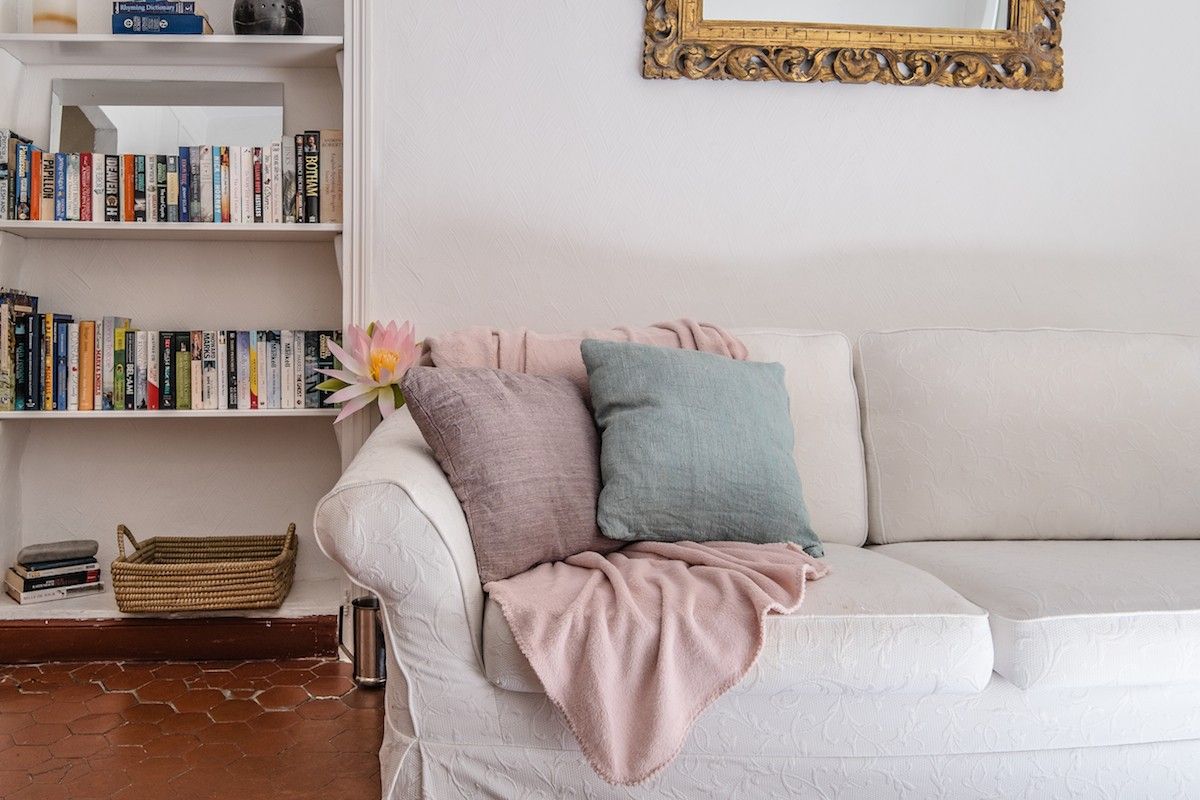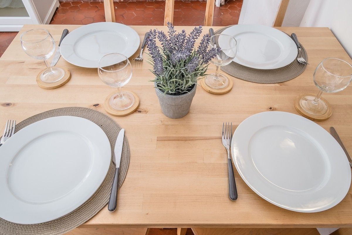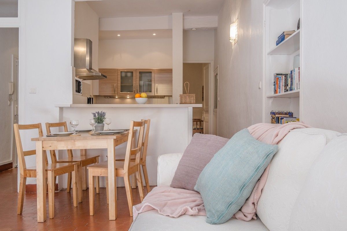 The open plan living area boasts the now quite rare and traditional Niçoise red tommasse floor throughout, which keep the apartment cool in the summer. The lounge area is filled with light and even though spacious has a wonderful relaxed warm feeling about it due to the ample three seater sofa and two French style armchairs. Enjoy the 32” LCD TV (French & English channels), free wifi and the selection of DVDs and library of books. (Please note that we cannot be held responsible for the disruption of internet access caused by internet providers)