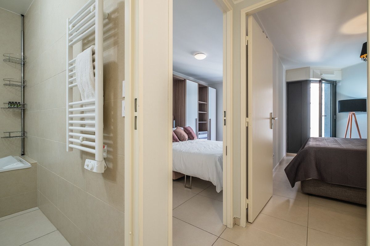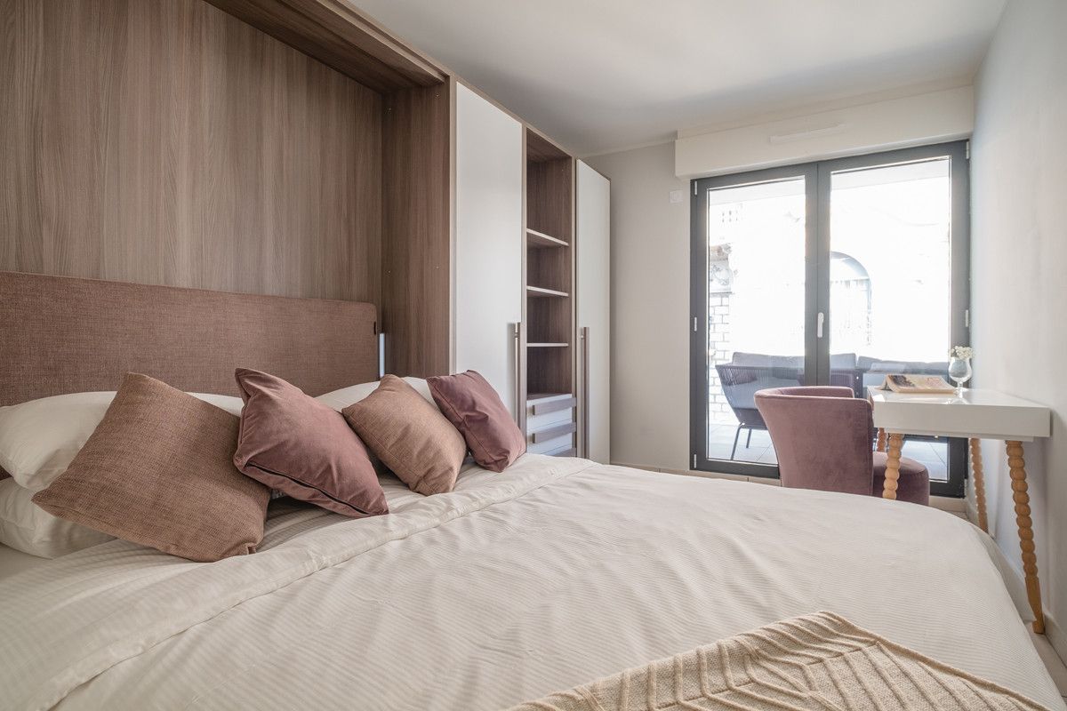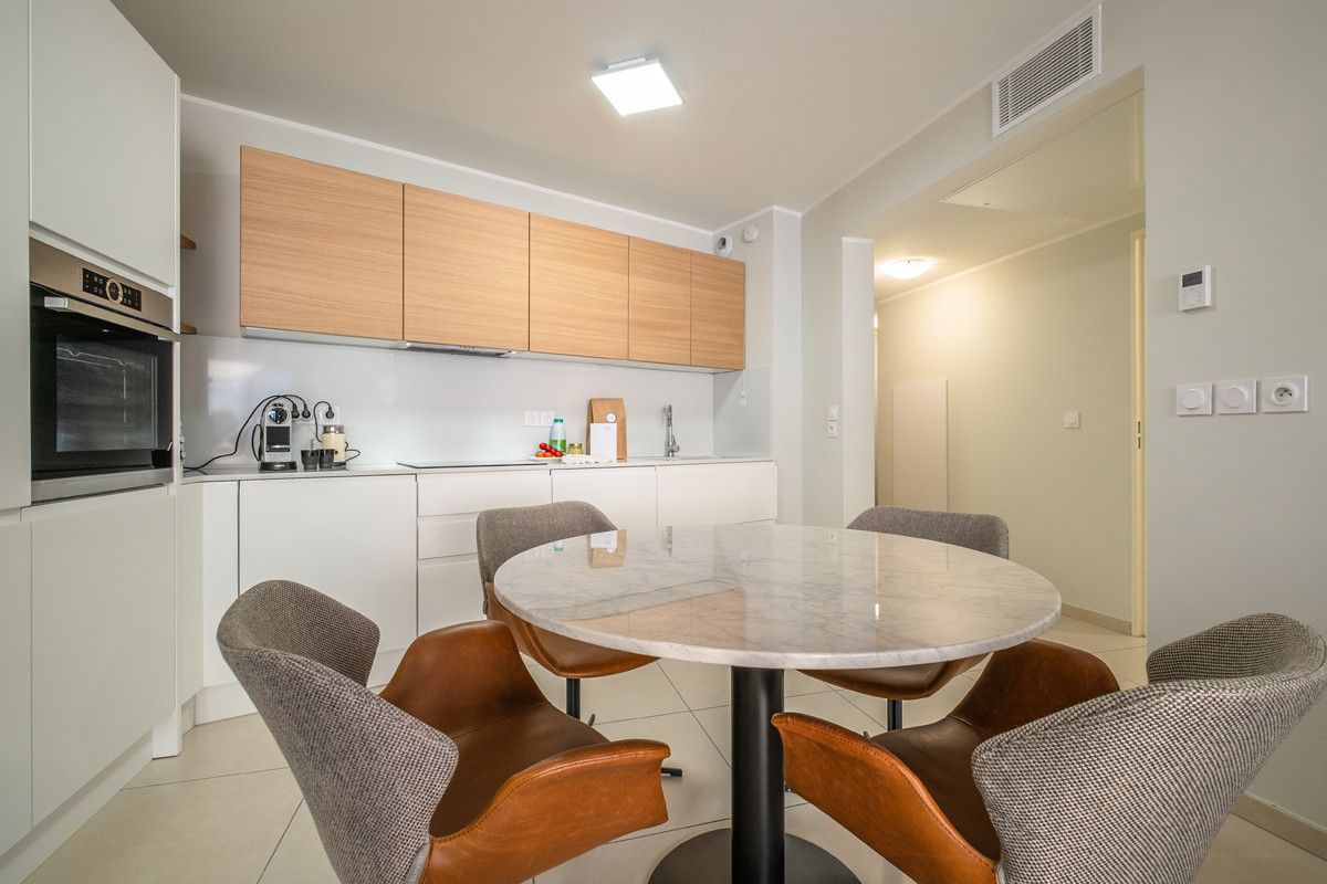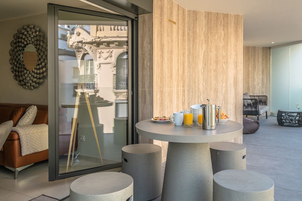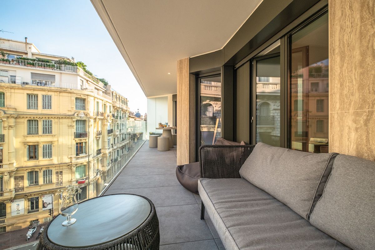 The enviable terrace is 15m2 with a long sofa at one end and a table and chairs for alfresco dining at the other. Kick back and enjoy the view of the classic Riviera façades and sunshine through the impressive glass railing of this ultramodern outside space.