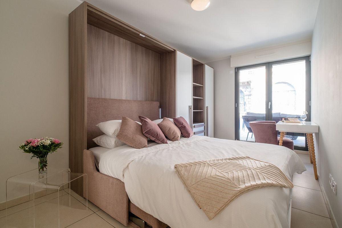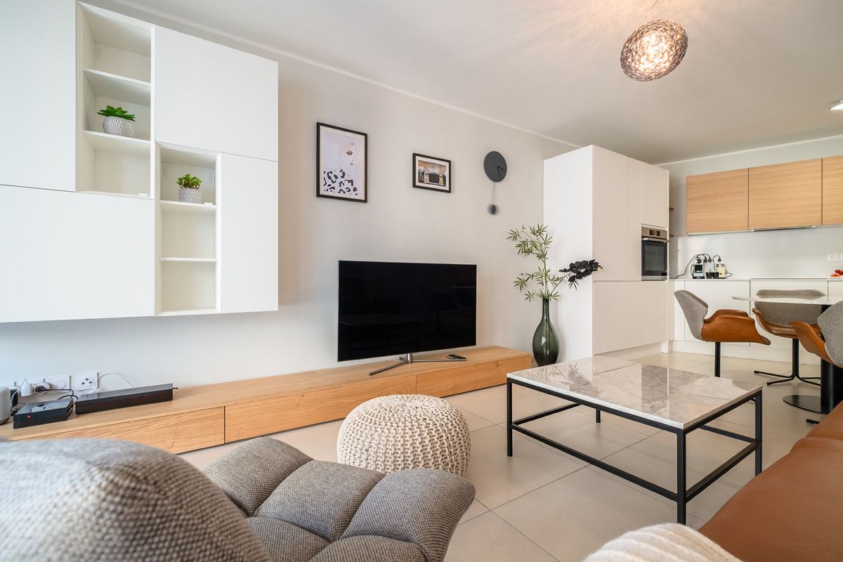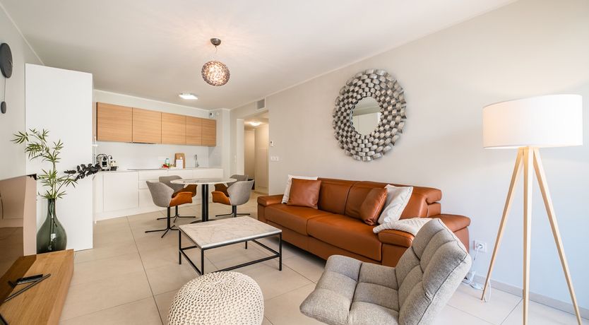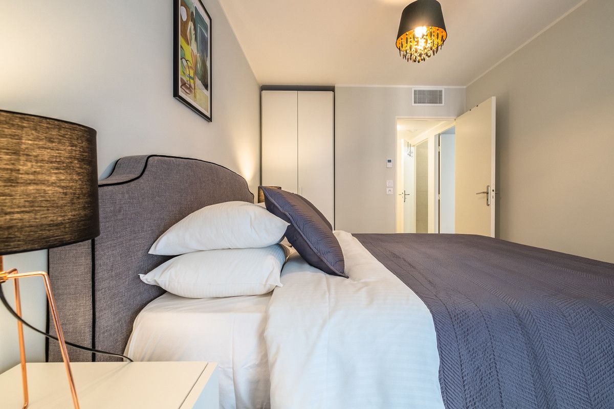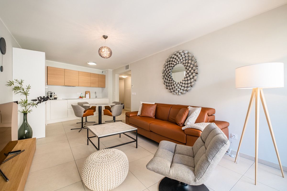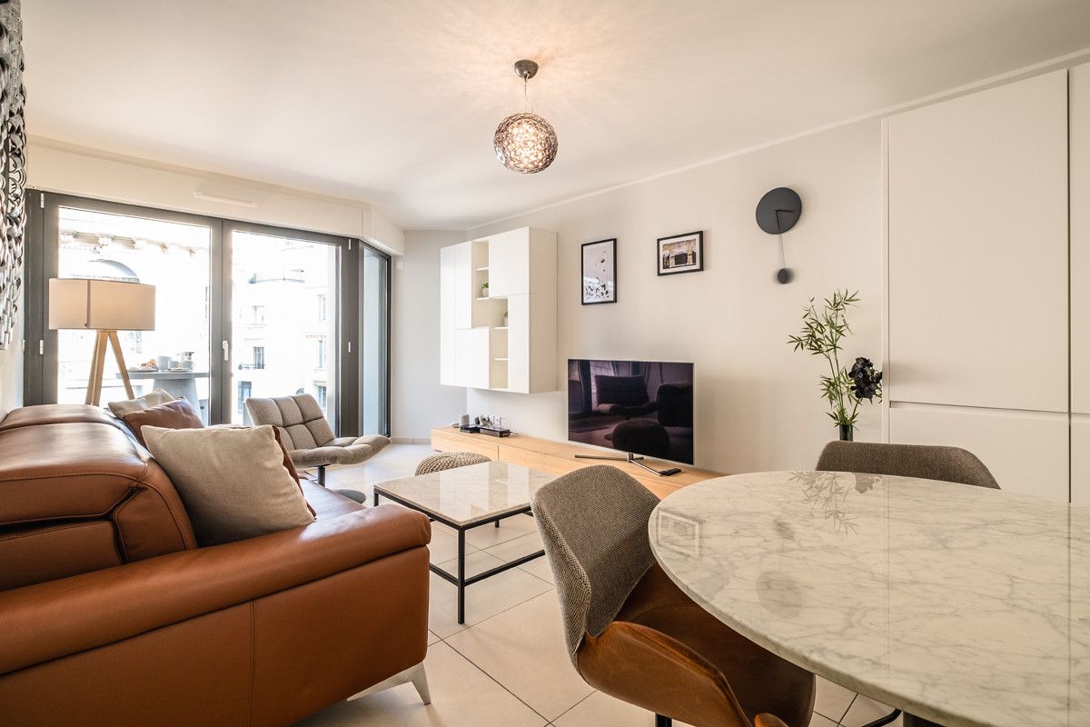 The enviable terrace is 15m2 with a long sofa at one end and a table and chairs for alfresco dining at the other. Kick back and enjoy the view of the classic Riviera façades and sunshine through the impressive glass railing of this ultramodern outside space.