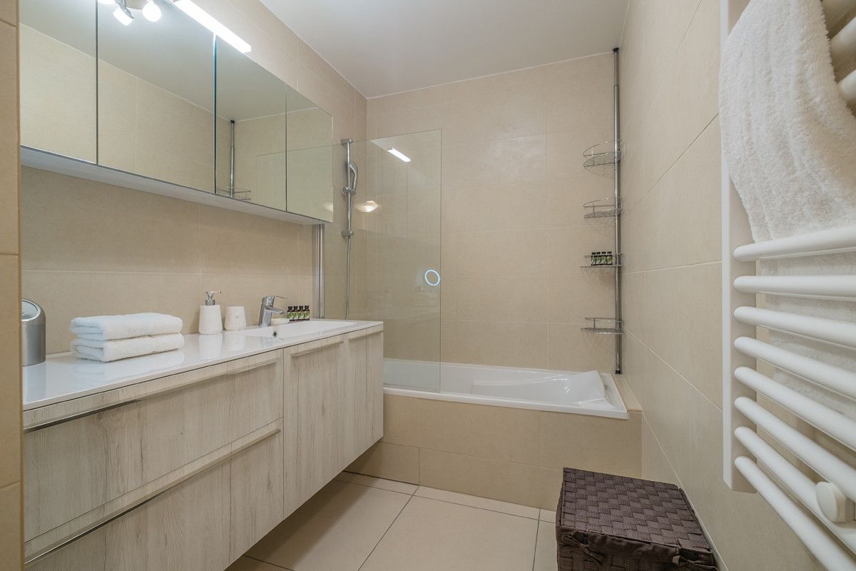 The Italian-tiled bathroom has excellent lighting, plenty of mirrored storage space and a bathtub for truly unwinding. It also has a shower fitting with glass screen and a heated towel rail.