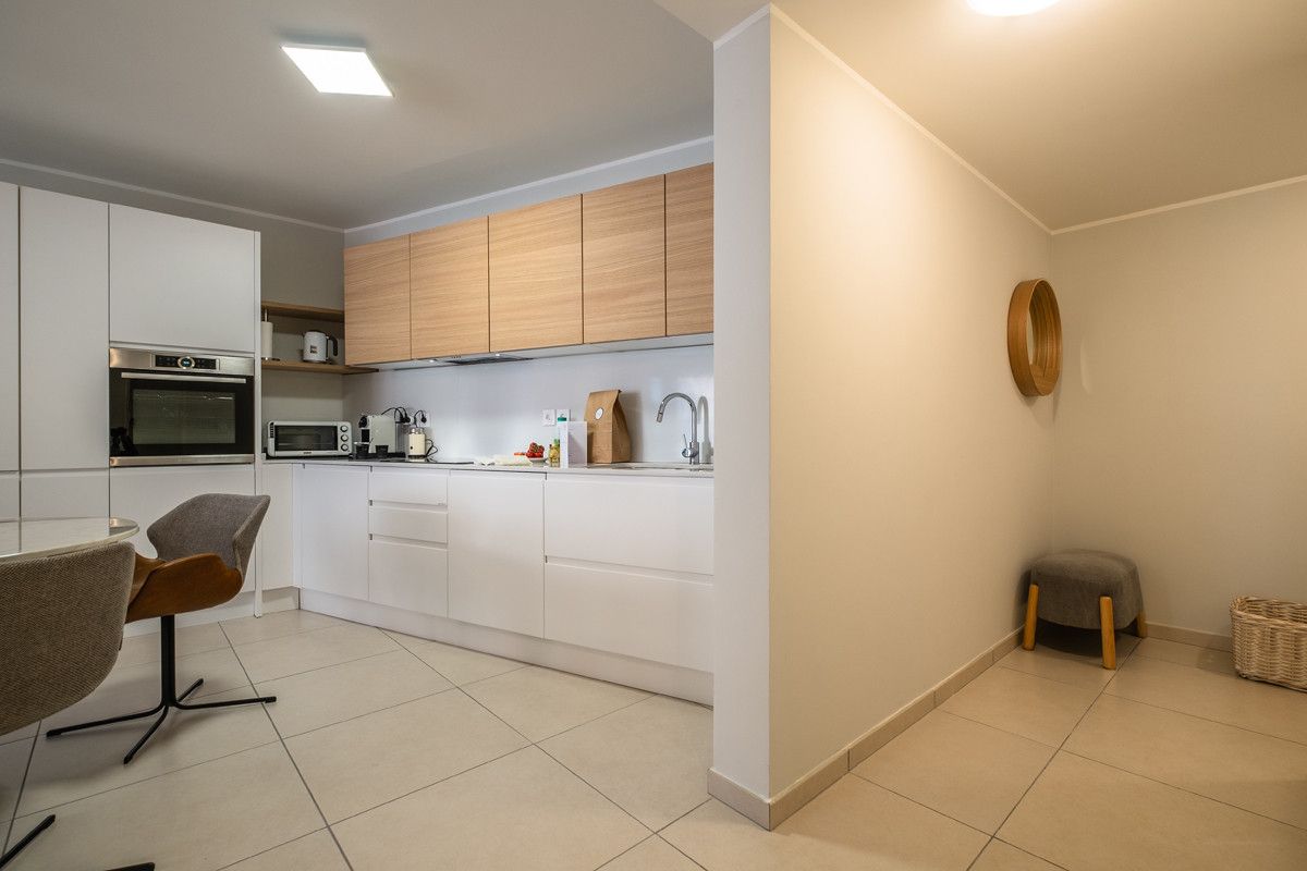 The open plan kitchen and living space opens on to the terrace creating a bright room at any time of day. The kitchen is fully equipped with an electric oven with four hobs, dishwasher, microwave, kettle and coffee machine. Full laundry equipment is also provided. A circular marble dining table with comfortable chairs for four will make every mealtime a pleasure and there is a matching marble coffee table in the lounge area, with a sleek leather sofa and comfortable armchair for relaxing in front of the TV.