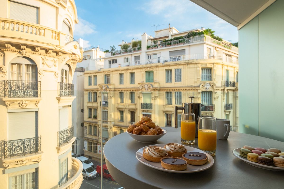 Local buses pass close by on rue de la Buffa and in the other direction on rue du Maréchal Joffre taking you towards the train station and to the shopping district. The soon-to-be-opened tram line will stop at Jardin Alsace-Lorraine taking you directly to the airport and in the meantime, direct airport buses can be caught on the seafront less than a two-minute walk away.