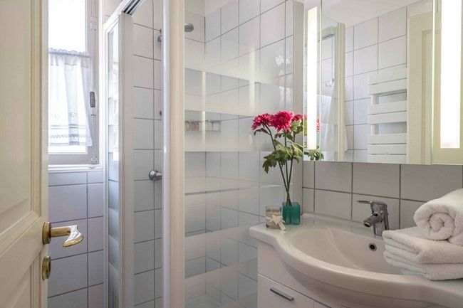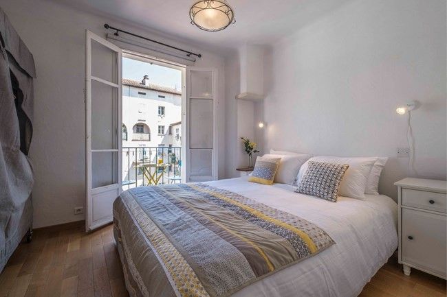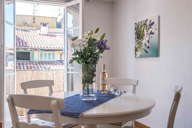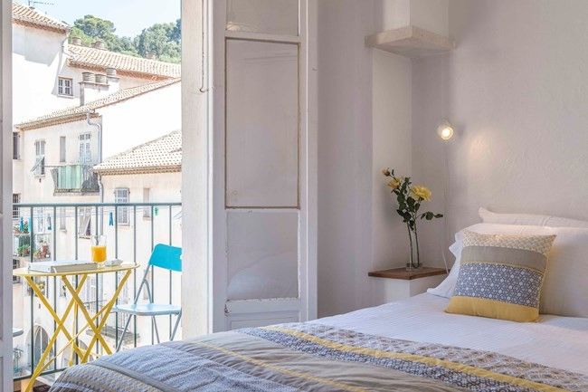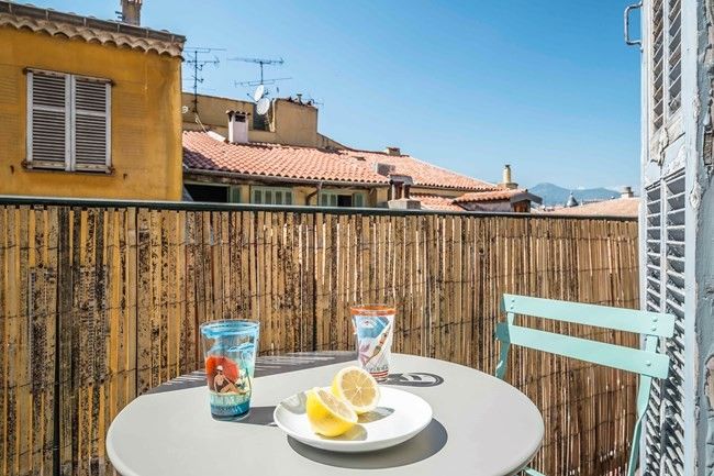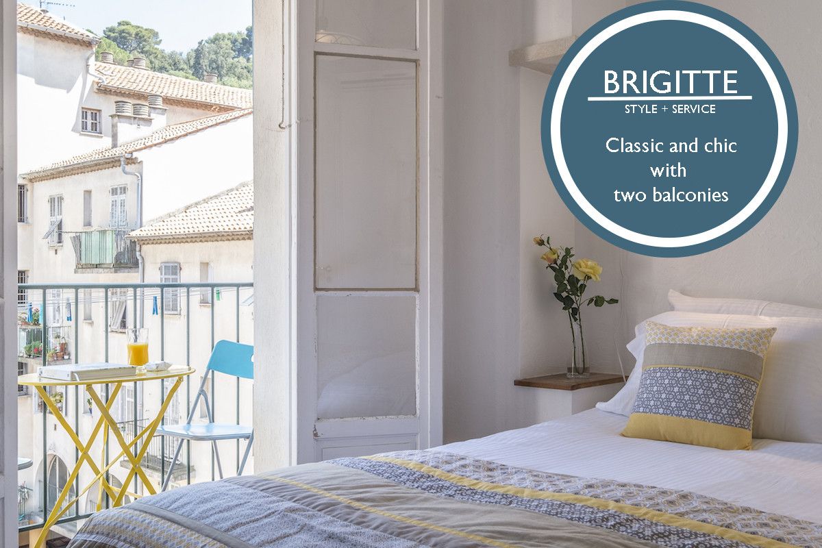 Brigitte spoils you with a balcony on both sides. A small one off the bedroom overlooks the inner courtyard and up to the trees on the Colline du Chateau and, a larger one off the living room looks down onto Rue de la Croix with its distinctive church tower and has chairs and a table for alfresco dining
