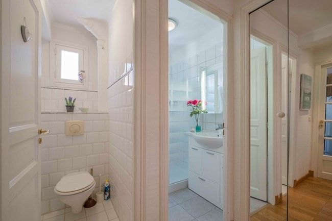 Both elegantly tiled in white with beautiful period windows, a separate shower room and toilet give your extra convenience. There is storage space and an illuminated vanity cupboard in the shower room.
