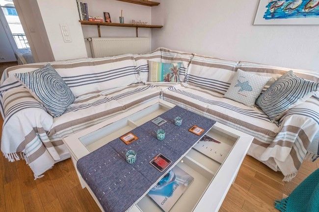 The spacious living/dining area has two French windows opening onto a balcony. A cosy L-shaped sofa, armchair and coffee table provide an area to relax in and there is a circular dining table to seat four. This open-plan area has wooden floors, lots of light and air, a TV with French and English news channels, DVD and a music system