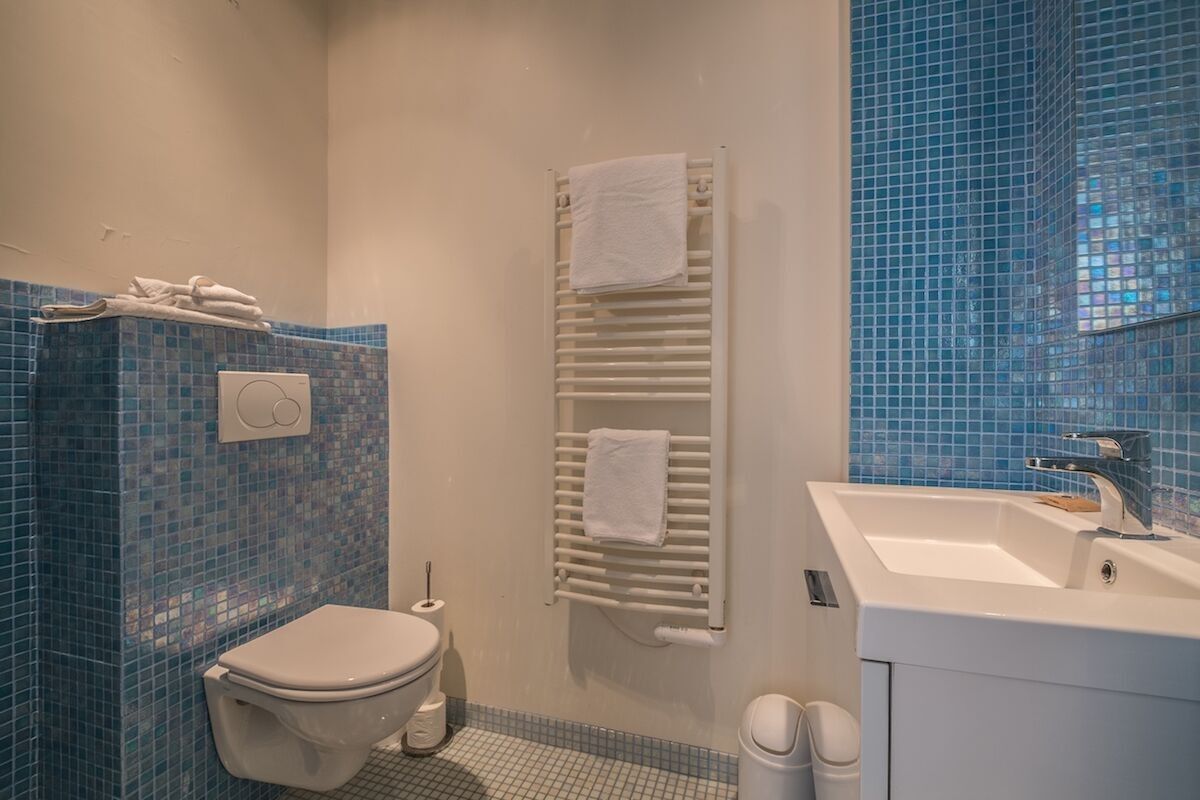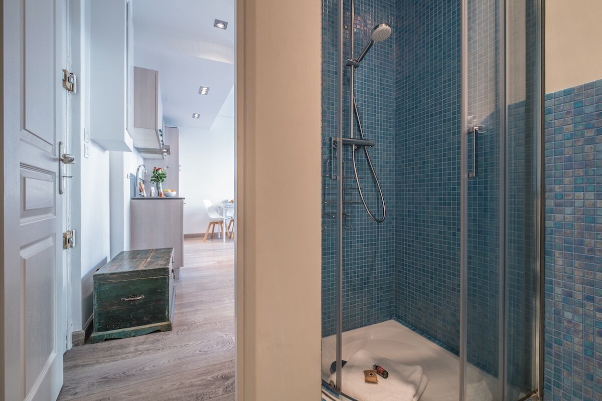 There are beautiful mosaic tiles in the bathroom, which has a shower and basin with storage for your cosmetics.