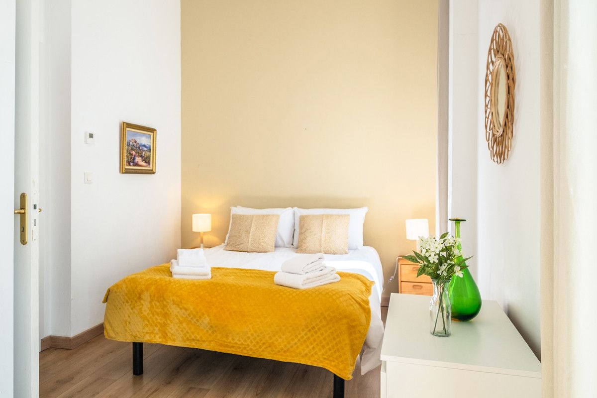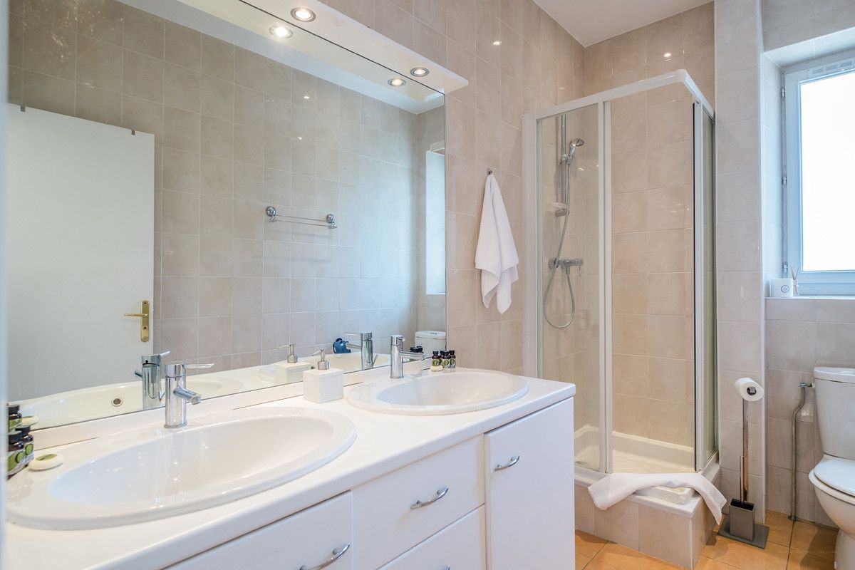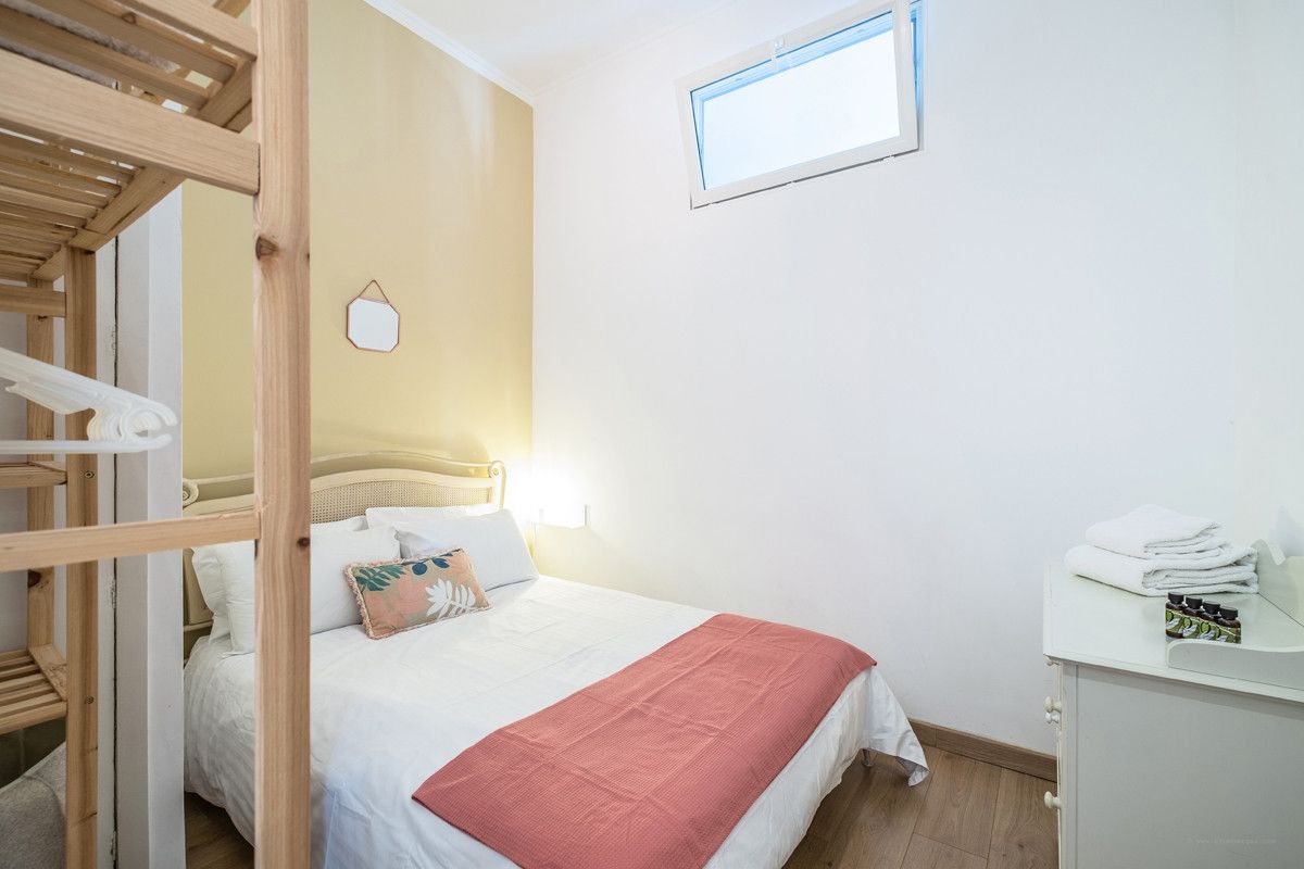 There are three double bedrooms (all mattresses are 140cm x 190cm), one beside the living room with a small window at the top and two at the back of the apartment. The main one has two windows, a built-in mirrored wardrobe, drawer space and bedside reading lamps. The two others bedrooms also have storage and there is reversible AC and double-glazing throughout.